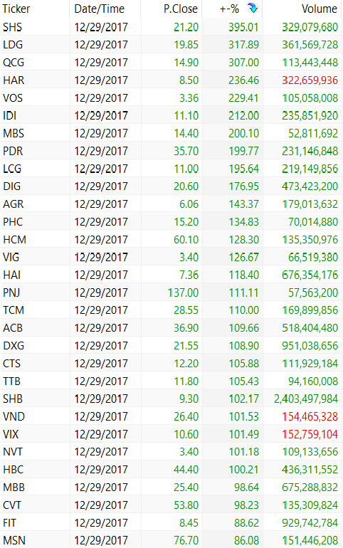 2.2. Danh sách cổ phiếu tăng giá mạnh nhất năm 2017: