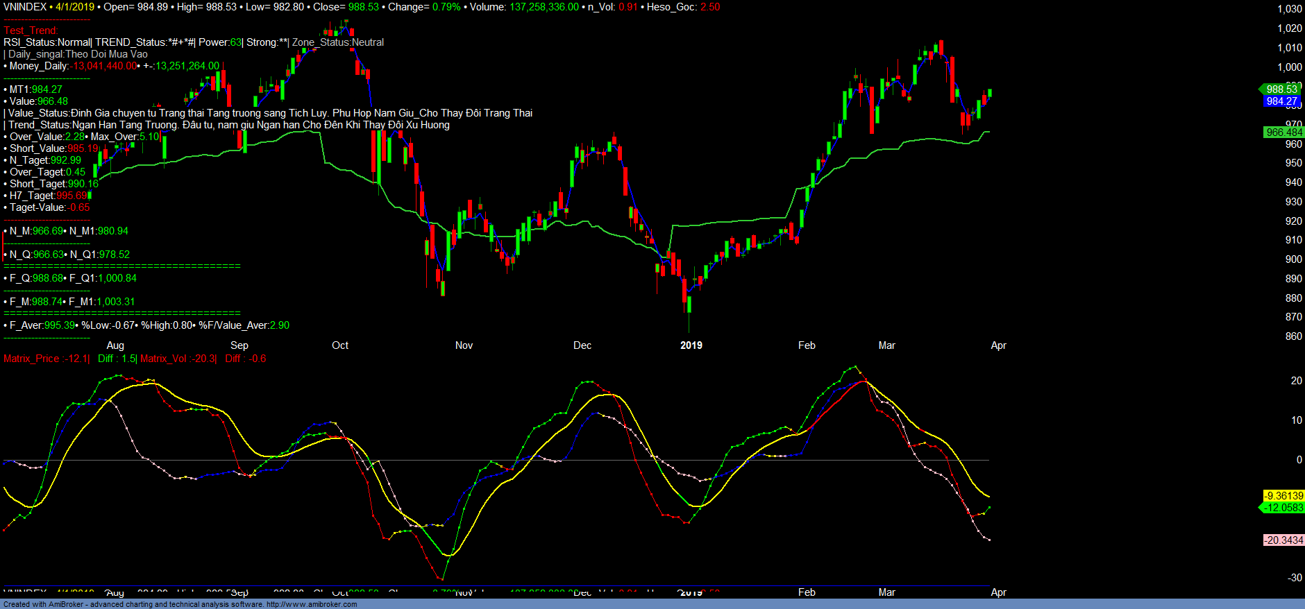 + Trend_up giảm, Money_in giảm. Dòng tiền và xu hướng Trend_up vẫn chưa cải thiện. Tuy nhiên số lượng mã có vùng mua và thu hút dòng tiền ngắn hạn đang gia tăng trở lại. Khá nhiều mã có vùng mua, tín hiệu mua ngắn hạn trở lại. Nổi bật như D2D, VNM, CVT, BMP, NTP, BMI, HBC, PHC, CLW, PVB, NTL, PXS, HVG, SKG, ASM. Lưu ý đa phần là các tín hiệu mua ngắn hạn hoặc hàng có sẳn T_0.
