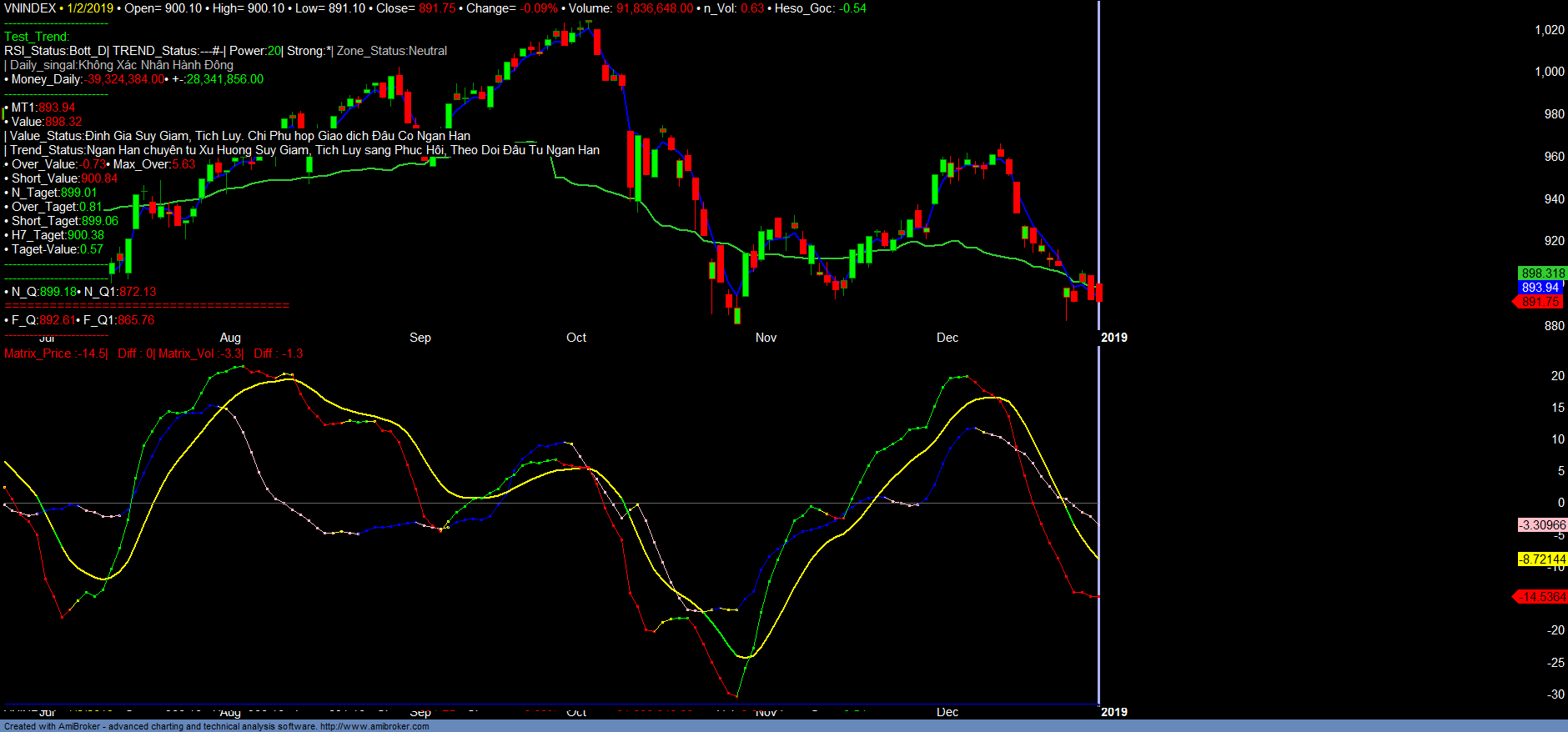 + Trend_up giảm, Money_in giảm. Dòng tiền và khẳ năng sinh lợi toàn thị trường tiếp tục giảm. Chưa thấy dấu hiệu dự báo thị trường sẽ tạo đáy. Tâm lý ngắn hạn của thị trường vẫn nằm sâu trong vùng bi quan.