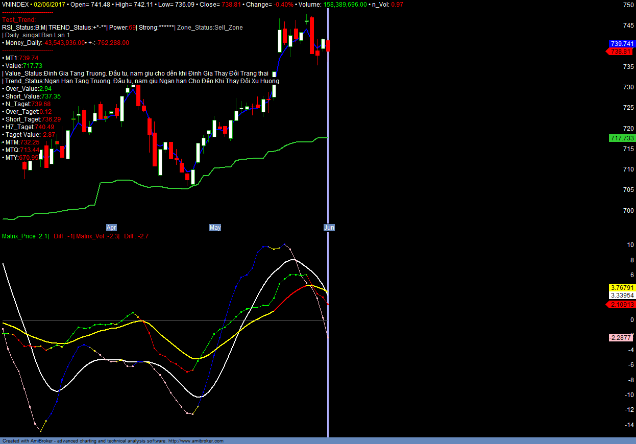 + Tổng quan thị trường: VNINDEX dưới ảnh hướng của cổ phiếu ROS đã điều chỉnh và sẽ kiểm tra lại hỗ trơ đỉnh cũ 730-732. Cổ phiếu ROS đang giảm khá mạnh, tuy nhiên cũng bắt đầu xuất hiện tín hiệu chuẩn bị bắt đáy ngắn hạn ở cổ phiếu này. Dư kiếngắn hạn Money-in sẽ xuất hiện khi ROS điều chỉnh về vùng hỗ trợ 100-110. Nhà đầu tư chỉ nên mở vị thế mua mới đối với các mã đạt điều kiện Vùng mua (Buy_Zone) và các mã đạt chuẩn trong danh mục Trend mới.