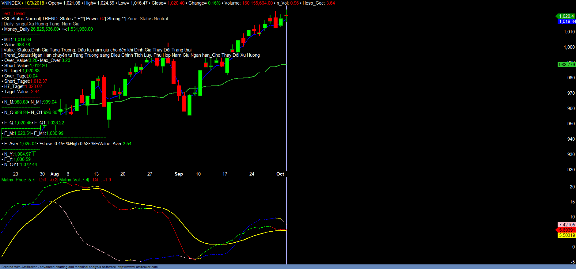 + VNINDEX vẫn duy trì xu hướng tăng với tín hiệu tích cực ở nhóm Bank, tuy nhiên khối lượng giao dịch giảm mạnh – 21,5% đối với VNINDEX, -13,75% đối với VN30. Khẳ năng sinh lợi Trend_up và dòng tiền Money_in tiếp tục suy giảm, cơ hội tìm kiếm lợi nhuận đã giảm. VN30 tích cực trở lại nhờ ảnh hưởng của nhóm bank, nhưng VCB vẫn duy trì quá trình tích lũy trong nền giá 62+-, và VN30 đang xác nhận vùng kháng cự mạnh 1000. Dự kiến thị trường dưới ảnh hưởng của VN30 tiếp tục tích lũy trong vùng 980-1000 trong 01 tuần đến để tạo nền tảng tích lũy vùng giá mới, chờ thông tin báo cáo tình hình kinh doanh Quí III/2018. Vì khẳ năng sinh lợi và dòng tiền suy yếu, ưu tiên tiếp tục tái cơ cấu danh mục ngắn hạn, hạ tỉ trọng ngắn hạn và magrin nếu có. Duy trì tỉ trọng đầu tư tăng trưởng theo xu hướng. Chỉ nên xem xét mở lại vị thế ngắn hạn khi dòng tiền có tín hiệu tạo đáy phục hồi. Chi tiết tham khảo các Danh mục.