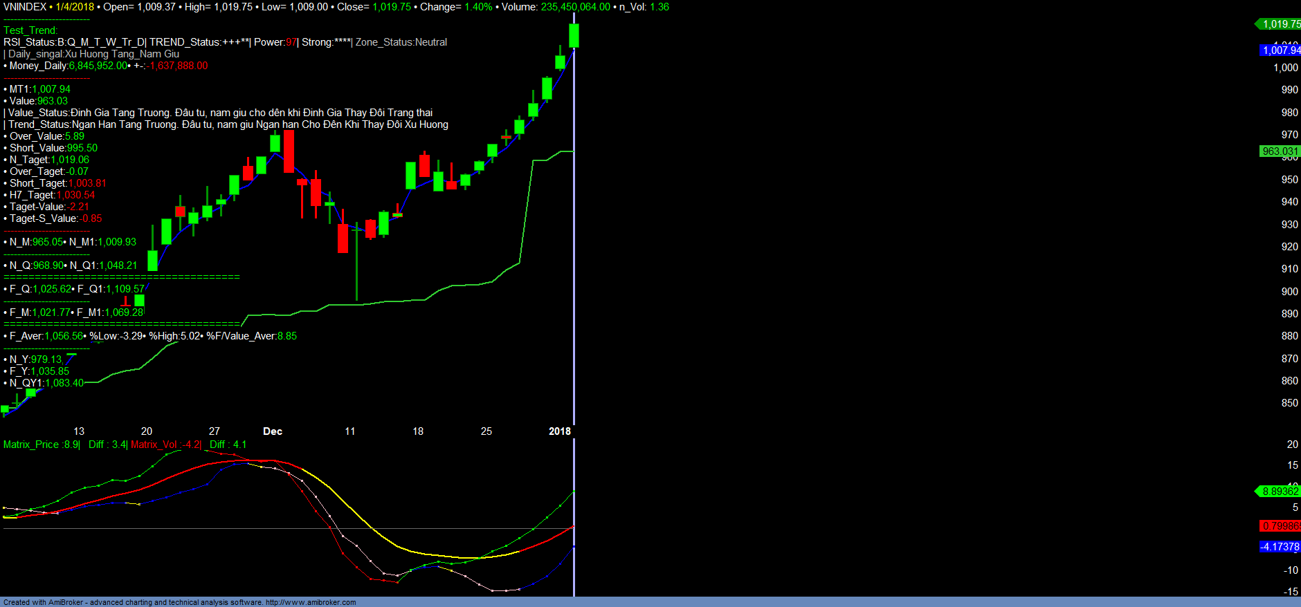 – VNINDEX đã vượt ngưỡng tâm lý 1000 kích thích dòng tiền money_in tiếp tục tăng. HNXINDEX như đã nhận định đã tạo đáy dài hạn và đi vào tăng trưởng trung dài hạn. Trong đó dòng tiền money_in tăng tốt ở nhóm BDS midcaps như QCG, KBC, KDH, TDH, DIG, DXG …., nhóm penny đang quá trình tạo đáy dài hạn như ITA, DLG, PPI, HQC, HHS …. Dòng tiền vẫn tiếp duy trì tốt với VN30. Vì vậy, nhà đầu tư có thể tiếp tục mở rộng vị thế mua đối với các mã đạt vùng mua và tín hiệu mua, cũng như các mã có xu hướng vào trend tăng mới. Có thể nâng ti trọng danh mục penny đang tạo đáy dài hạn lên. Chi tiết tham khảo Matrix_Filter và các Danh Mục.