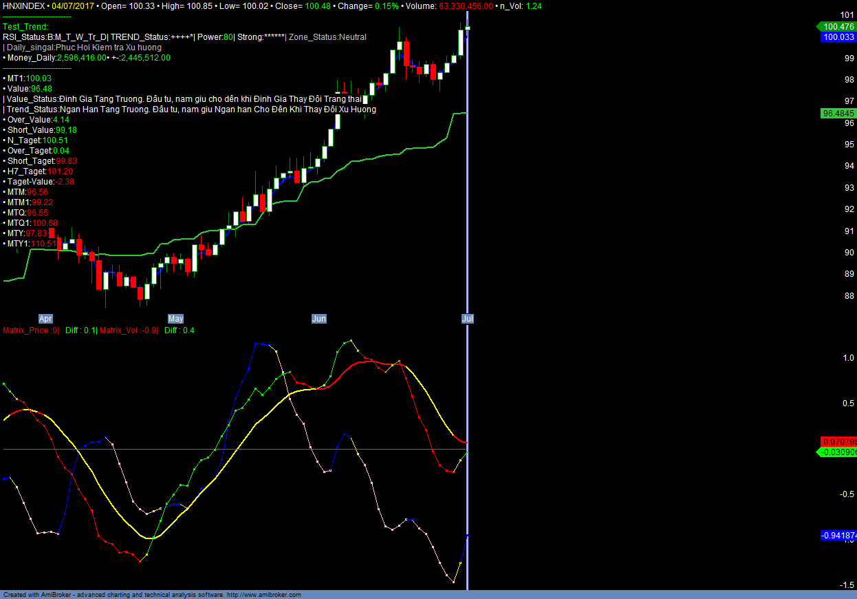 + Hiện tại định giá của HNXINDEX đã được tăng từ 94.5+- lên 96.4, VNINDEX là 740 lên 750, Tuy nhiên các mức taget và H7_taget vẫn không được nâng lên tương ứng. Điều này cho thấy ngắn hạn thị trường đã và đang phản ánh kỳ vọng tương lai trước khi thị trường nâng mức định giá. Dự kiến Vùng kháng cự và taget của VNINDEX là 800-810, HNXINDEX là 103-108. Dự kiến tại vùng giá này thị trường sẽ chưa thể vượt qua được trong vòng 1-2 tháng tiếp theo. Không nên mở thêm vị thế mua mới tại vùng này, tiếp tục nắm giữ cổ phiếu theo xu hướng ngắn hạn của từng cổ phiếu. Chi tiết tham khảo Matrix_Filter