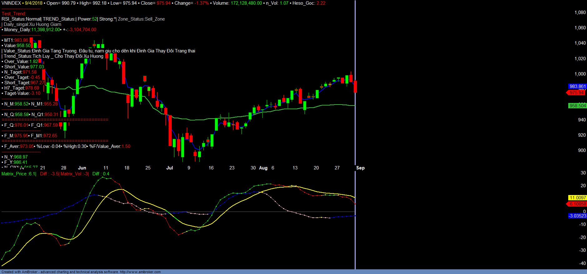 + Trend_up tăng, Money_in giảm mạnh. Dòng tiền ngắn hạn suy yếu. Số lượng mã vào Vùng bán, hạ tỉ trọng ngắn hạn daily tăng mạnh và áp đảo vùng Mua.