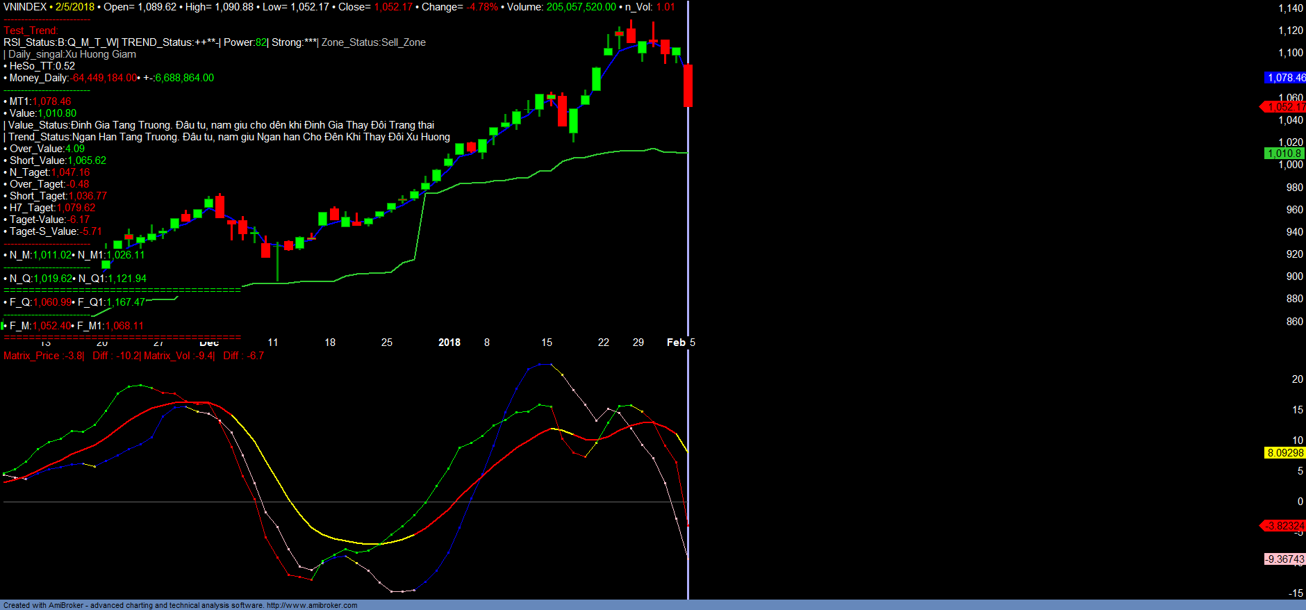 + VNINDEX có phiên giao dịch giảm điểm mạnh nhất trong nhiều năm qua với mức giảm kỷ lục 5,1%. Áp lực bán tăng mạnh thể hiện qua khối lượng giao dịch tăng, đặc biệt với nhóm cổ phiếu VN30 trong phiên chiều. Điều này là do VNINDEX và VN30 đã mất hỗ trợ trend tăng trưởng ngắn hạn tương ứng giá trị Short_value hiện nay đang là 1065-1068 và 1056-1063. Dòng tiền vẫn chưa có dấu hiệu giảm tốc độ giảm, cho thấy vẫn chưa có tín hiệu bắt đáy. Dự kiến trong 1-3 phiên giao dịch đến khi VNINDEX tiếp tục điều chỉnh về vùng 1020-1030 thì thị trường sẽ phân hóa, không xuất hiện tín hiệu giảm đồng loạt như những phiên giao dịch gần đây. VNINDEX sẽ phục hồi lại vùng 1055-1065 để xác nhận lại xu hướng trend tăng ngắn hạn. Đây là nhịp phục hồi để xem xét tái cơ cấu, giảm tỉ trọng đầu tư của các mã đang có tín hiệu chuyển trạng thái ngắn hạn suy yếu. Tỉ trọng hợp lý trong giai đoạn hiện nay không nên vượt quá 50% Cổ phiếu. Các vị thế mua mới vẫn không đảm bảo khả năng sinh lợi trong T+3. Nhà đầu tư đã giữ vị thế an toàn và chủ động giải ngân mới, tiếp tục kiên nhẫn chờ tín hiệu dòng tiền tăng trưởng trở lại. Chi tiết tham khảo Matrix_Filter và các Danh Mục.