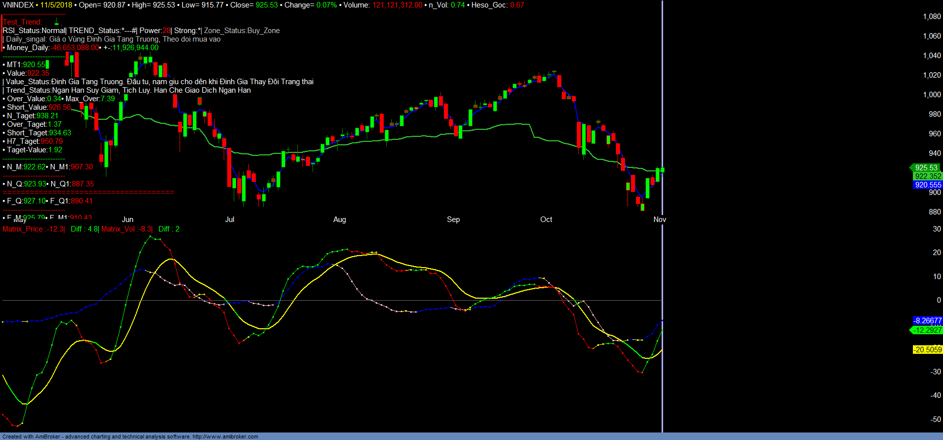 + VNINDEX tiếp tục tăng điểm nhẹ với khối lượng giao dịch thấp, giảm -42,07% so với phiên trước. Với tín hiệu dòng tiền cho thấy rằng, thị trường đang trong giai đoạn tích lũy, dòng tiền chỉ tham gia ở vùng giá thấp, hỗ trợ. VNINDEX dự kiến vẫn duy trì xu hướng tăng với mục tiêu 960-970. Quá trình này sẽ kéo dài, liên tục xảy ra rung lắc điều chỉnh cho đến tháng 12/2019 với rất nhiều mốc kháng cự đã mất 930, 940, 950, 960.