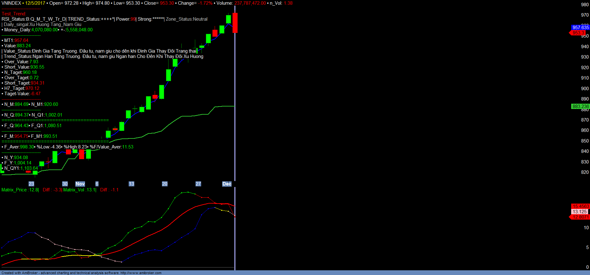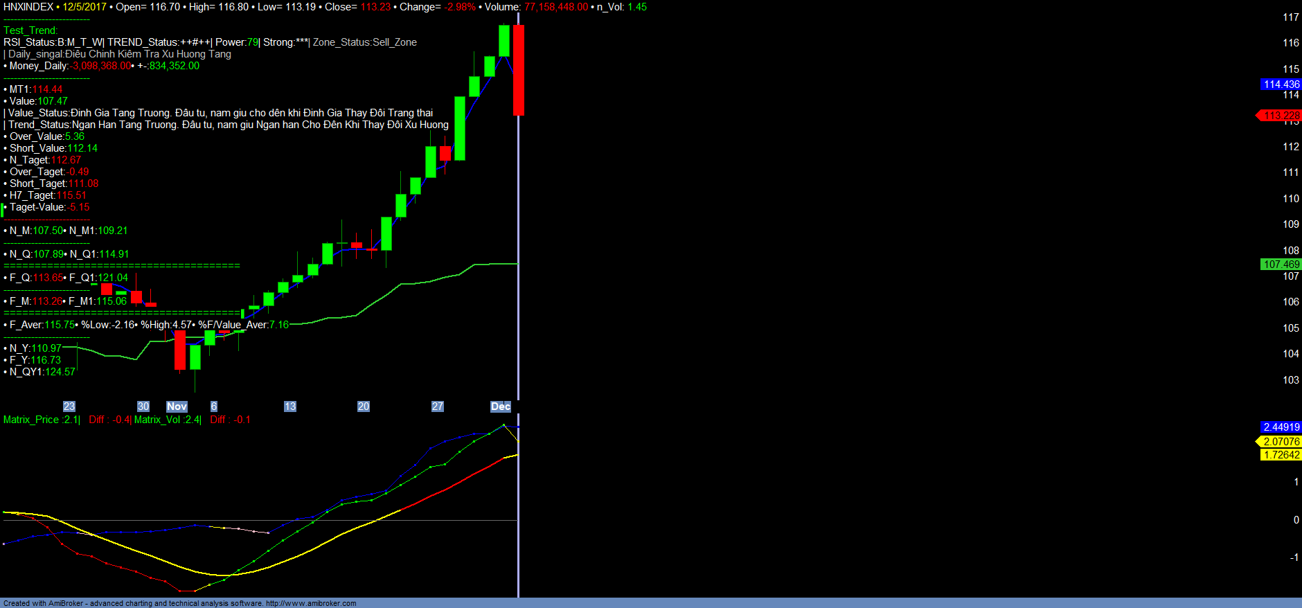 – Trend_up tăng, Money_in phục hồi. Sau những phiên dòng tiền suy giảm như nhận định đầu tuần, thị trường đã xảy ra điều chỉnh mạnh trong phiên giao dịch hôm nay 05/12/2017. Mặc dù dòng tiền có tín hiệu gia tăng, và vẫn luân chuyển trong thị trường thể hiện qua 1 số nhóm mã vẫn tăng tốt như dòng oto HAX, săm lốp DRC, CSM, SRC…, mía đường SBT và 1 số mã BDS như DRH, DIC…, nhưng cần kiểm chứng theo dõi tiếp trong vài phiên giao dịch đến. Xu hướng Lượng đi trước giá trong ngắn hạn cũng đang có tín hiệu kết thúc. Áp lực bán, hạ ti trọng ngắn hạn cũng như margin khá lớn, thể hiện qua số mã vào vùng Bán tăng áp đảo.