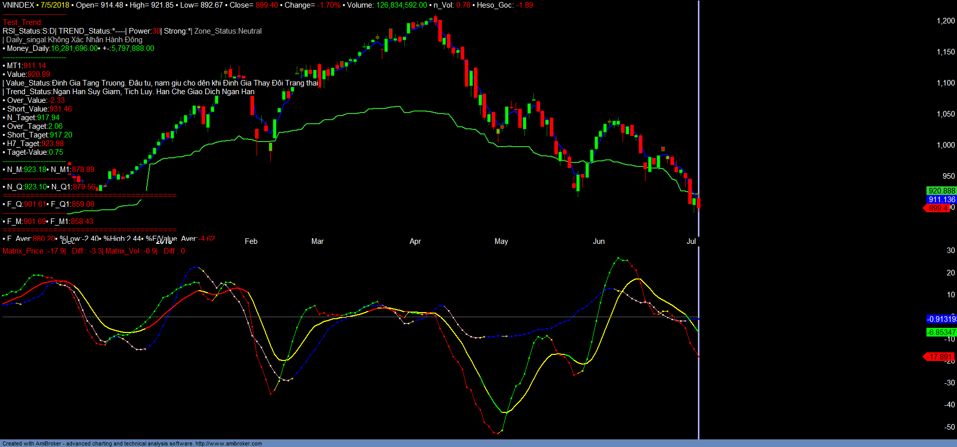 + VNINDEX, đã điều chỉnh trở lại với khối lượng gia tăng, nhưng thấp hơn phiên giảm điểm mạnh ngày 03/07/2018. Áp lực bán, cắt lỗ hay call magrin vẫn rất mạnh và hầu hết đều đã và đang đưa tất cả các mã bị điều chỉnh về các vùng hỗ trợ trung bình dài hạn. Như CTG điều chỉnh rất mạnh từ 37-38 về trở lại vùng giá 18-20, là vùng giá đã tích lũy kéo dài trong nhiều năm mới Break được trong năm 2017. Hay CVT đang về lại vùng giá năm 2016. Do đó, xét về quan điểm đầu tư dựa trên cơ sở thị trường dài hạn vẫn tăng trưởng, thì quá trình điều chỉnh mạnh đã đưa rất nhiều cổ phiếu về vùng giá trung bình dài hạn hấp dẫn. Một số nhiều nhóm mã như VSC, DRC, CTD…, mặc dù VNINDEX đã phá vỡ vùng đáy cũ 916 nhưng các mã này vẫn ko thấp hơn vùng đáy trước đây. Như vậy nếu nhóm mã này tạo xu hướng tăng trở lại, phân kỳ với chỉ số VNINDEX thì thị trường sẽ xác nhận đáy ngắn trung hạn. Trong ngắn hạn, tâm lý thị trường vẫn khá hoảng loạn, rất nhiều mã tiếp tục giảm mạnh, nhưng Trend_up tốc độ giảm đã chậm lại, điều này cho thấy xu hướng giảm giá luân phiên cũng sẽ dần kết thúc để thị trường hồi phục.