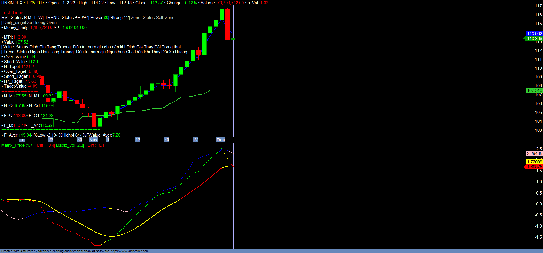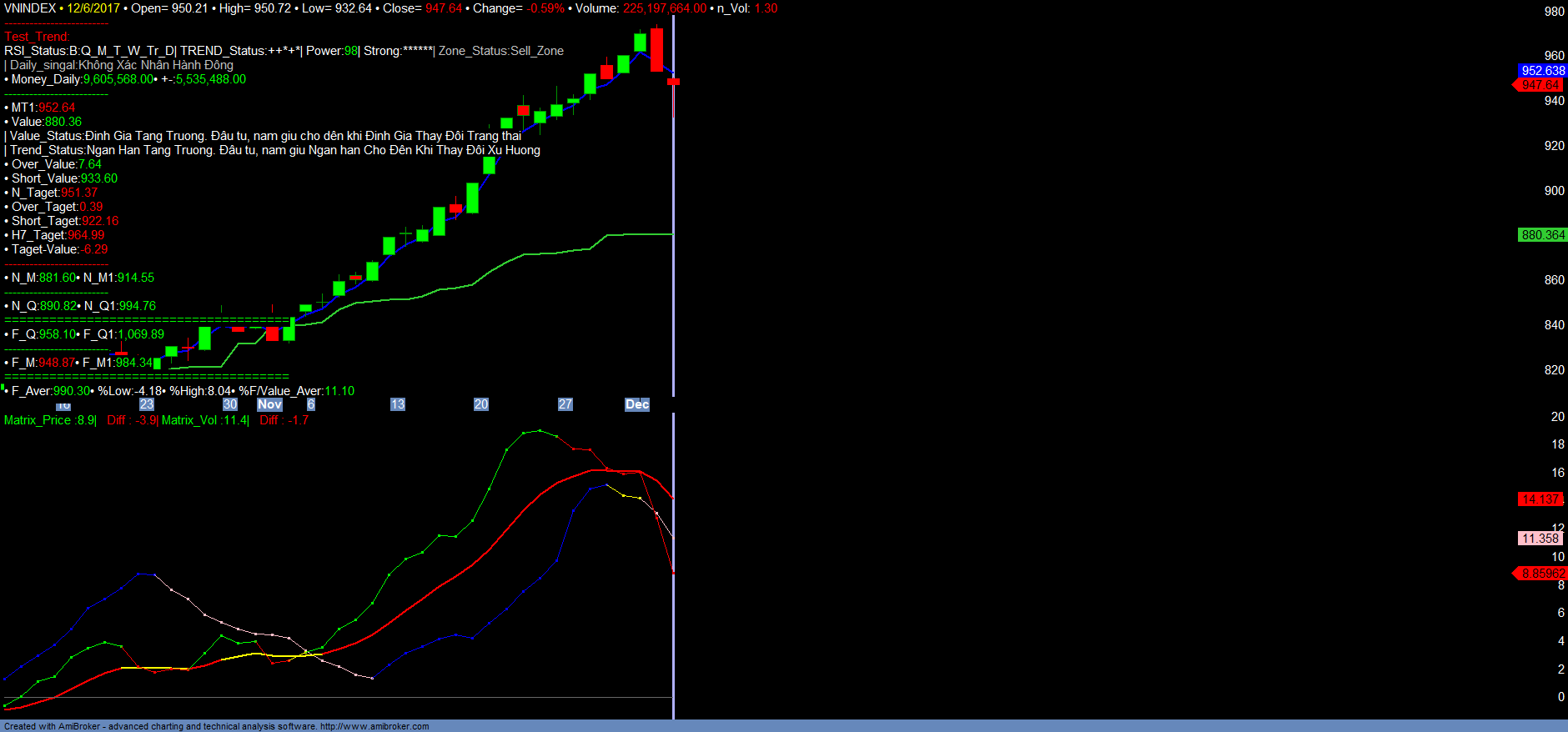 Như nhận định phiên 05/12.2017, các chỉ số VNINDEX, VN30, HNXINDEX đã điều chỉnh rất mạnh và chạm vùng hỗ trợ tăng trưởng Short_value tương ứng, sau đó phục hồi vào cuối phiên. Các chỉ số VNINDEX, VN30, HNXINDEX đều đã đi vào vùng bán ngắn hạn, do quá trình tăng nóng và vượt khá xa giá trị định giá. Khẳ năng sinh lợi hiện nay của các chỉ số là “âm”. Tuy nhiên do các chỉ số đang Over định giá khá xa, vì vậy dư kiến thị trường không thể tiếp tục tăng trưởng mạnh nữa, mà phải tích lũy điều chỉnh, chờ đợi báo cáo kết quả kinh doanh Quí IV cũng như cả năm. Thời gian tích lũy dự kiến có thể kéo dài đến hết năm 2017, bởi thị trường cũng như các mã tăng trưởng mạnh trong thời gian vửa qua sẽ cần những dữ liệu đáng tin cậy để tính toán lại Định giá cũng như mức độ tăng trưởng trong năm tiếp theo. Nhà đầu tư nên cân nhắc cơ cấu danh mục ngắn hạn, magrin để chuẩn bị cho các cơ hội đầu tư mới nếu có. Vị thế mua mới cũng như danh mục đề xuất mới sẽ không được khuyến nghị mở thêm cho đến khi có những dữ liệu đánh giá chính xác hơn trong thời điểm cuối năm. Tỉ trọng danh mục đầu tư vẫn có thể tiếp tục nắm giữ cho đến khi có tín hiệu thay đổi xu hướng ngắn hạn. Chi tiết tham khảo Matrix_Fiter và các Danh mục.
