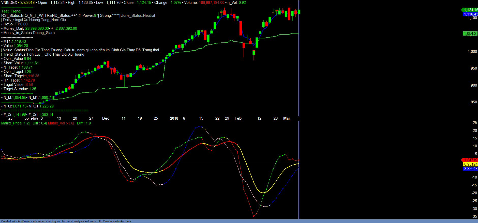 + VNINDEX, VN30 sau thời gian tăng liên tục kéo dài từ 12/2016 đến nay, mặc dù trong ngắn hạn đã được nâng mức Định giá tuy nhiên mức tăng không đủ lớn để nâng khẳ năng sinh lợi (Taget – Value âm). Phiên giao dịch 08/03/2018 mặc dù VN30 tăng điểm mạnh nhưng tín hiệu dòng tiền của VN30 vẫn suy giảm. Với nền tảng khối lượng giao dịch thấp của VN30, thị trường bắt đầu có dấu hiệu phân hóa khi Trend_up bắt đầu suy yếu. Trong các giai đoạn trước đây. chỉ số VN30 luôn sinh lợi tốt so với VNIDNEX, tuy nhiên giai đoạn gần đây VN30 bắt đầu yếu hơn VNINDEX, khối lượng cũng suy giảm dần. Vì vậy, nếu không xét các mã riêng biệt trong nhóm VN30 vẫn có thể sinh lợi ngắn hạn như VNM, VIC.. thì cần phải chờ khối lượng VN30 tích lũy trở lại. Thị trường cần phải tích lũy để đạt chuẩn dòng tiền Money_in tăng trở lại. Cũng như chờ thị trường tiếp tục nâng định giá trong thời điểm chốt NAV quí 1/2018 sắp đến mới đủ điều kiện để đánh giá khẳ năng vượt đỉnh tiếp theo.