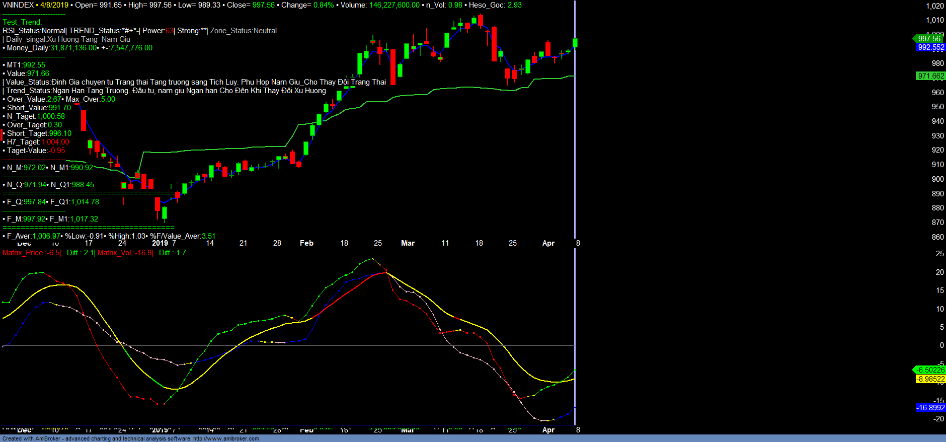 + Trend_up giảm, Money_in tăng. Trend_up, khẳ năng sinh lợi có tín hiệu zich_zac, tăng giảm liên tục. Điều này cho thấy khẳ năng sinh lợi, dòng tiền xoay tua liên tục qua từng nhóm mã. Nhiều mã kéo tăng 1-3 phiên rồi lại điều chỉnh tích lũy. Nhiều mã ngay sau khi break đỉnh cũ gần nhất, lập tức chịu áp lực chốt lời ngắn hạn và quay trở lại điều chỉnh tích lũy. Số lượng mã có Vùng mua ngắn hạn vẫn lớn hơn vùng bán, tiếp tục duy trì tốt đối với nhóm cổ phiếu Dầu khí, và một số cổ phiếu nổi bật như GIL, NDN, TDH, TCL, CCL… vẫn có thể xem xét gia tăng tỉ trọng đầu tư đầu cơ.