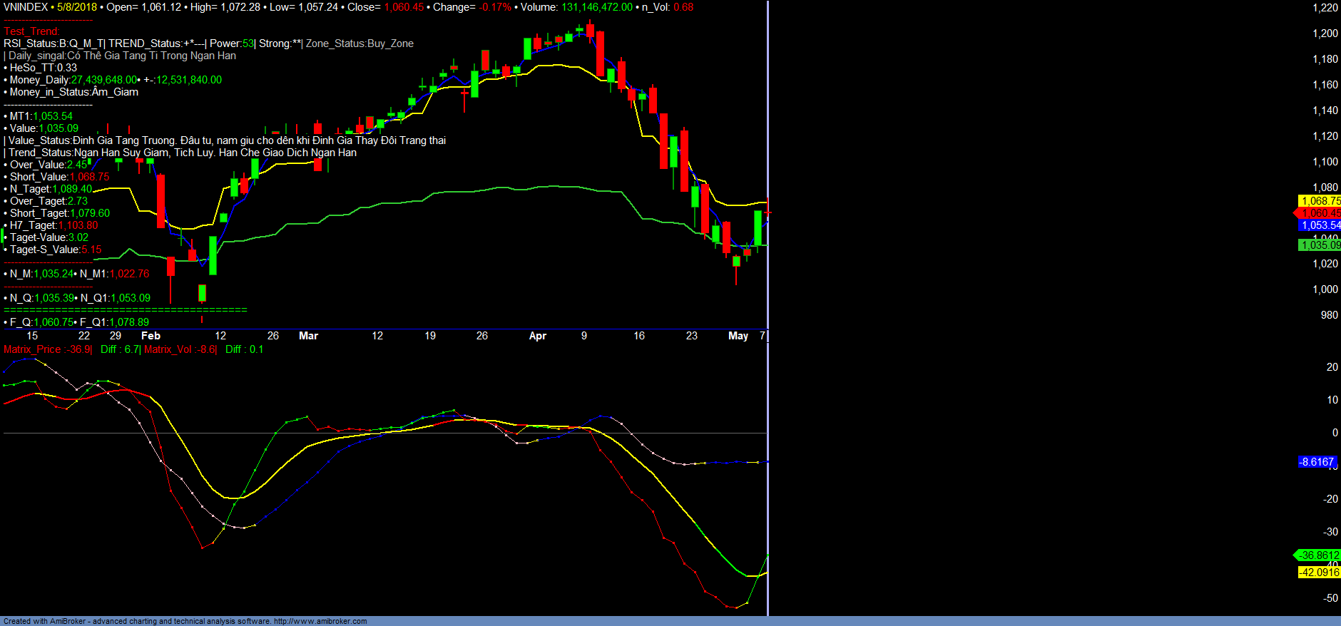 + VNINDEX đang điều chỉnh giảm điểm trung hạn và ở nhịp phục hồi ngắn hạn để kiểm tra lại xu hướng Trend Short_value. Thị trường chỉ có thể tạo đáy và tăng trưởng khi có tín hiệu dòng tiền trung hạn cũng như xu hướng ngắn hạn Short_value tăng trưởng. Vì vậy, giai đoạn hiện nay, cần kiên nhẫn chờ tín hiệu dòng tiền và xu hướng trend_up xác nhận tăng. Sau nhịp điều chỉnh tích lũy trung hạn, sẽ xuất hiện các mã, nhóm mã tăng trưởng tốt hơn so với thị trường chung. Lúc đó mới xem xét mở vị thế đầu tư với nhóm mã này. Dự kiến điểm mua đầu tư mới sẽ được cập nhật trong tháng 06/2018 sau khi xác nhận được tốc độ tăng trưởng trong 2 quí tiếp theo của năm 2018, cũng như danh mục mã tăng trưởng tốt nhất. Chi tiết tham khảo các Danh mục.