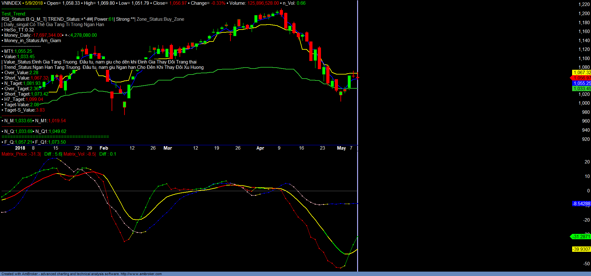 + VNINDEX đang điều chỉnh giảm điểm trung hạn và ở nhịp phục hồi ngắn hạn để kiểm tra lại xu hướng Trend Short_value. Thị trường chỉ có thể tạo đáy và tăng trưởng khi có tín hiệu dòng tiền trung hạn cũng như xu hướng ngắn hạn Short_value tăng trưởng. Sau nhịp điều chỉnh tích lũy trung hạn, sẽ xuất hiện các mã, nhóm mã tăng trưởng tốt hơn so với thị trường chung. Nhà đầu tư tỉ trọng tiền mặt cao có thể xem xét mở vị thế mua ngắn hạn đối với các mã, nhóm mã trên. Vị thế, điểm mua đầu tư trung dài hạn mới sẽ được cập nhật trong tháng 06/2018 sau khi xác nhận được tốc độ tăng trưởng trong 2 quí tiếp theo của năm 2018, cũng như danh mục mã tăng trưởng tốt nhất. Chi tiết tham khảo các Danh mục.