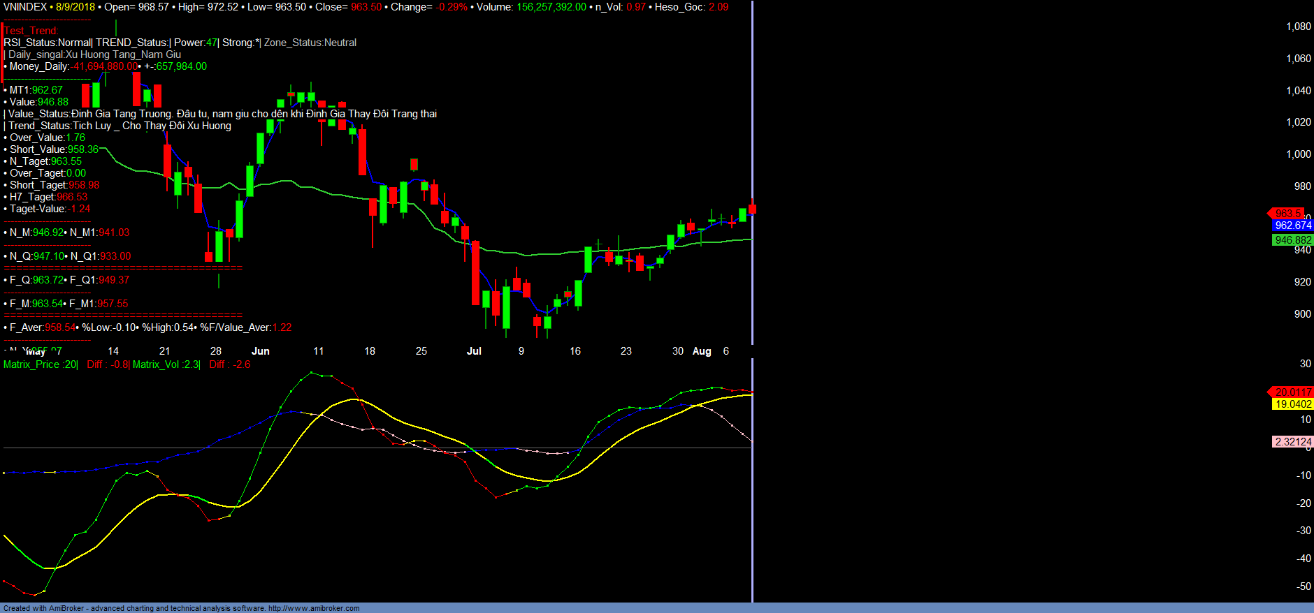 + Lý do giai đoạn này VNINDEX không thể tăng mạnh mà liên tục xảy ra tình trạng rung lắc là vì tốc độ tăng trưởng tương ứng mức over định giá chỉ 3-4%, cũng như thị trường liên tục gặp những kháng cự. Do đó việc giải ngân ngắn hạn chỉ bảo đảm lợi nhuận tại các vùng hỗ trợ tương ứng. Dự kiến VNINDEX sẽ điều chỉnh kiểm tra lại hỗ trợ ngắn hạn 958-960 và tiếp tục tích lũy rung lắc liên tục với mục tiêu tối đa 98x trong quí III/2018. Nhà đầu tư nếu không lướt sóng ngắn hạn được vẫn tiếp tục duy trì nắm giữ. Dòng tiền Money_in tiếp tục suy yếu, phân hóa mạnh. Các vị thế mở mua thêm chỉ được khuyến nghị tập trung vào số ít mã tăng trưởng chủ chốt trong ngóm ngân hàng, chứng khoán, BĐS hay các mã dầu khí có khối lượng giao dịch, dòng tiền lớn tham gia và đạt vùng mua. Chi tiết tham khảo các Danh mục.