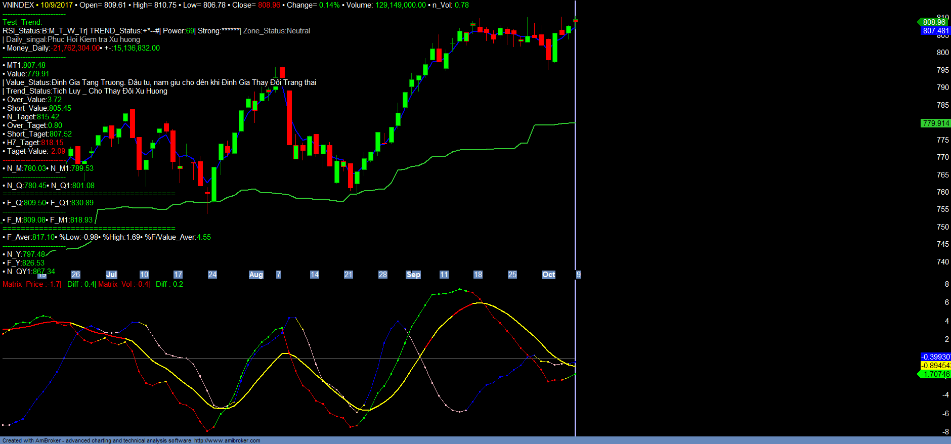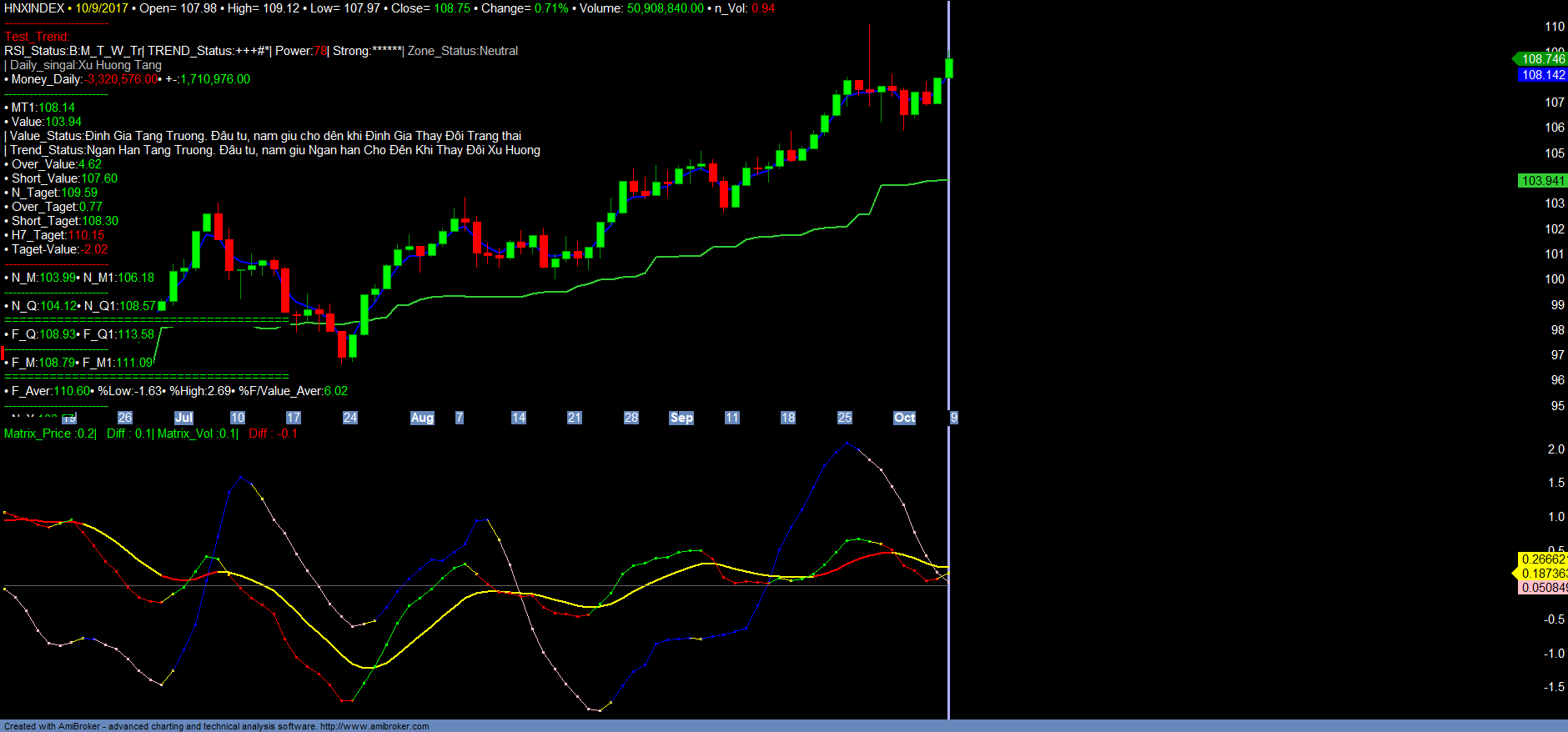 + Thống kê thị trường: Trend_up giảm, tốc độ giảm đã chậm lại, Money_in giảm. Về thị trường chung mặc dù HNXINDEX đã và đang xác nhận chu kỳ tăng trưởng dài hạn mới, tuy nhiên hiện HNXINDEX có kháng cự rất mạnh tại vùng 110-112, tương ứng với ACB là vùng kháng cự đỉnh cũ 32.5-33.2. Hạn chế mua đuổi tại vùng này.