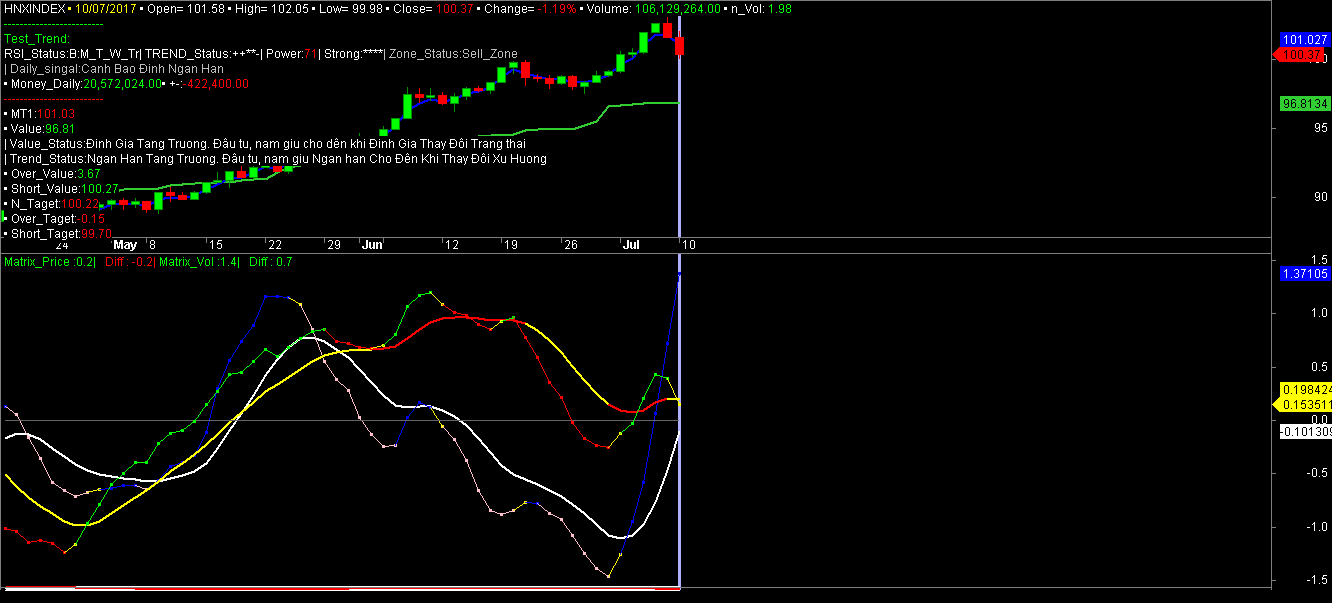 + Định giá của thị trường hiện nay VNINDEX là 745+-, HNINDEX là 96+-. Dự kiến trong 2-4 phiên tới sẽ có thể xuất hiện tín hiệu kết thúc 1 nhịp tăng của VNINDEX từ 706 đến 783. Sau đó sẽ chuyển qua giai đoạn tích lũy tạo nền và kiểm tra lại giá trị Định giá. Do đó tại những điểm phục hồi ngắn hạn sắp đến, nên tiến hành cơ cấu danh mục ngắn hạn, giảm tị trọng ngắn hạn các mã đã tăng quá mạnh vượt quá xa giá trị định giá và cover lại sau. Đối với các mã tăng trưởng hiện thị giá gần sát định giá và vẫn đang vào trend mới, vẫn có thể tiếp tục nắm giữ. Chi tiết tham khảo Matrix_Filter.