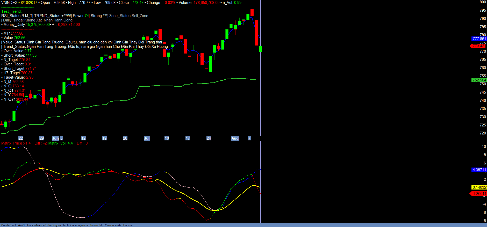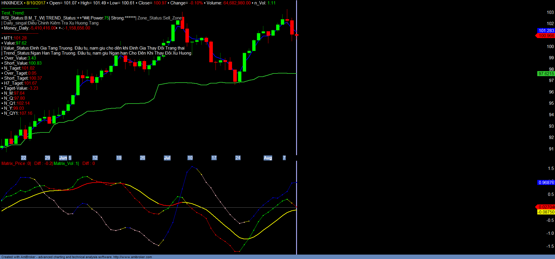 + Trend_up giảm, Money_in giảm: Khối lượng giao dịch đã giảm mạnh trở lại sau phiên biến động khối lượng lịch sử 09/08/2017 do ảnh hưởng chính của chỉ số VN30 thể hiện tâm lý thận trọng của thị trường hiện nay. HNXINDEX sau khi gặp đỉnh cũ đã điều chỉnh và chuyển qua giai đoạn tích lũy với hỗ trợ tâm lý 100. Hiện nay tín hiệu dòng tiền vẫn trên trung bình và hầu hết các mã tăng trưởng khi gặp hỗ trợ định giá tăng trưởng đều đã cho tín hiệu phục hồi tốt, như 1 số nhóm mã thị trường có khối lượng giao dịch lớn HUT, SCR, CII… Điều này sẽ hỗ trợ tâm lý cũng như xác định nền giá tích lũy trong ngắn hạn cũng như đưa ra những tín hiệu tích cực đầu tiên, định hướng dòng tiền chọn lọc các mã có dư báo tình hình kết quả kinh doanh Quí 3 vẫn tăng trưởng tích cực và có mức giá đã điều chỉnh hợp lý về vùng hỗ trợ. Do đó trong giai đoạn hiện nay, mặc dù chỉ số VN30 là khá khó dự báo do thị trường Phái Sinh ban đầu áp dụng, có thể làm nhiễu chỉ số VNINDEX. Nhà đầu tư có thể hạn chế tham gia vào các mã trong VN30 nếu như ko kiểm soát tốt, tại thường điểm hiện nay chỉ nên mua đầu tư cho mã có dự phóng quí 3, quí 4 tốt. Danh mục đề xuất sẽ cập nhật vào cuối tuần.
