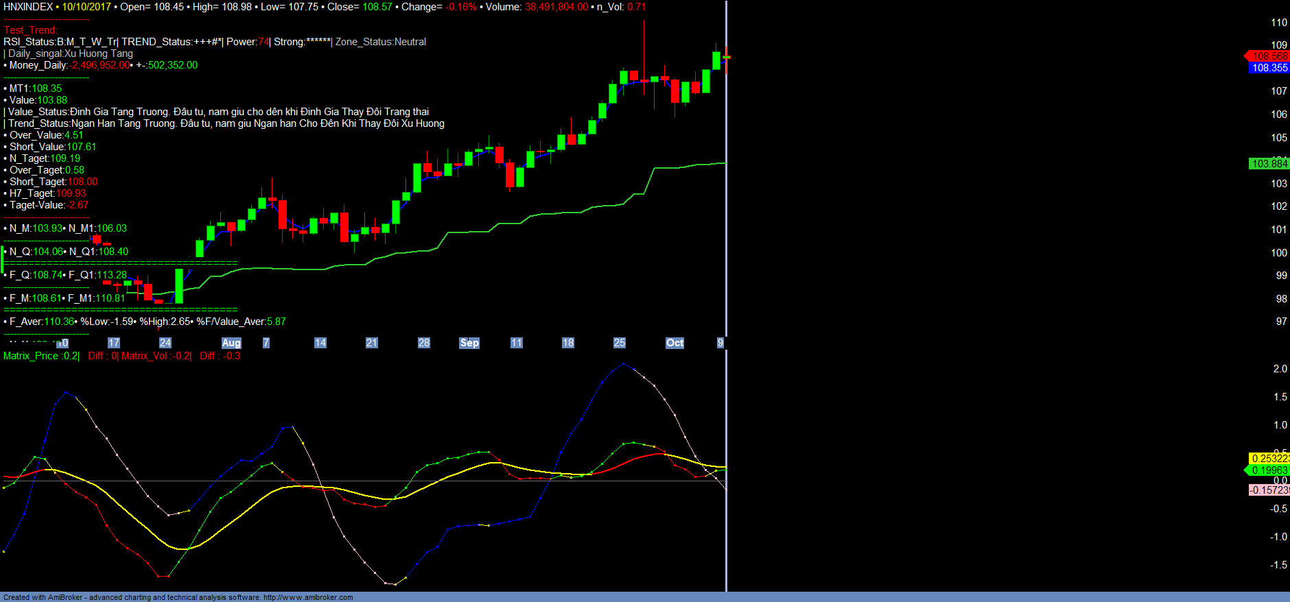+ Thống kê thị trường: Trend_up giảm, tốc độ giảm đã chậm lại, Money_in tăng. Về thị trường chung mặc dù HNXINDEX đã và đang xác nhận chu kỳ tăng trưởng dài hạn mới, tuy nhiên hiện HNXINDEX có kháng cự rất mạnh tại vùng 110-112, tương ứng với ACB là vùng kháng cự đỉnh cũ 32.5-33.2. Hạn chế mua đuổi tại vùng này.