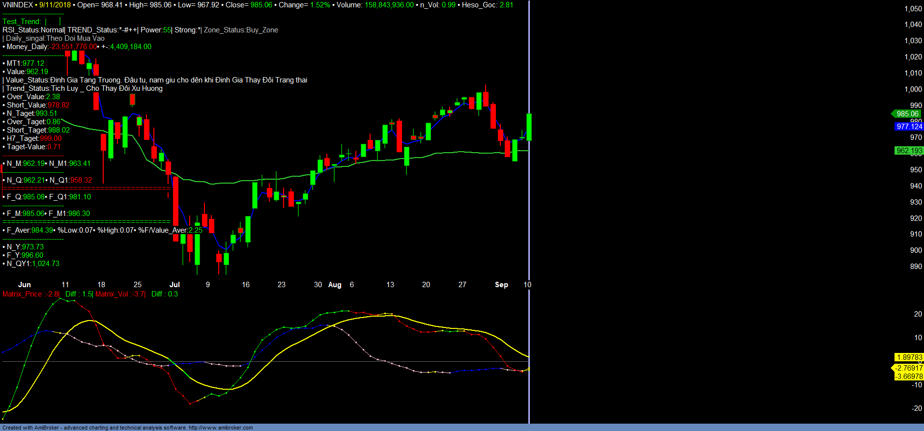 + Ngắn hạn dự kiến VNINDEX trong phiên giao dịch 12/09/2018 VNINDEX sẽ tiếp tục tiến đến vùng 989-993 sau đó điều chỉnh kiểm tra lại vùng 980-982 đã vượt để xác nhận lại xu hướng Short_value tăng trưởng trong thời điểm cuối tuần và đầu tuần sau. Lưu ý VNINDEX sẽ tăng trưởng chậm, taget dự kiến đến cuối năm hiện kỳ vọng dự báo 1040-1060, dòng tiền luân chuyển liên tục trong ngắn hạn. Vì vậy, nhà đầu tư nên tiếp tục duy trì nắm giữ tỉ trọng đầu tư các cổ phiếu có Định giá tăng trưởng. Có thể cơ cấu danh mục đầu tư qua các mã cùng nhóm ngành mạnh hơn, hiệu suất đầu tư tốt hơn. Gia tăng thêm tỉ trọng đầu tư và ngắn hạn các mã đầu tư mới đối với các mã có Định giá tăng trưởng đạt vùng mua hoặc vào trend tăng mới tại vùng hỗ trợ tương ứng. Tham khảo thêm các mã mới cập nhật trong Danh mục đề xuất. Chi tiết tham khảo các Danh mục.