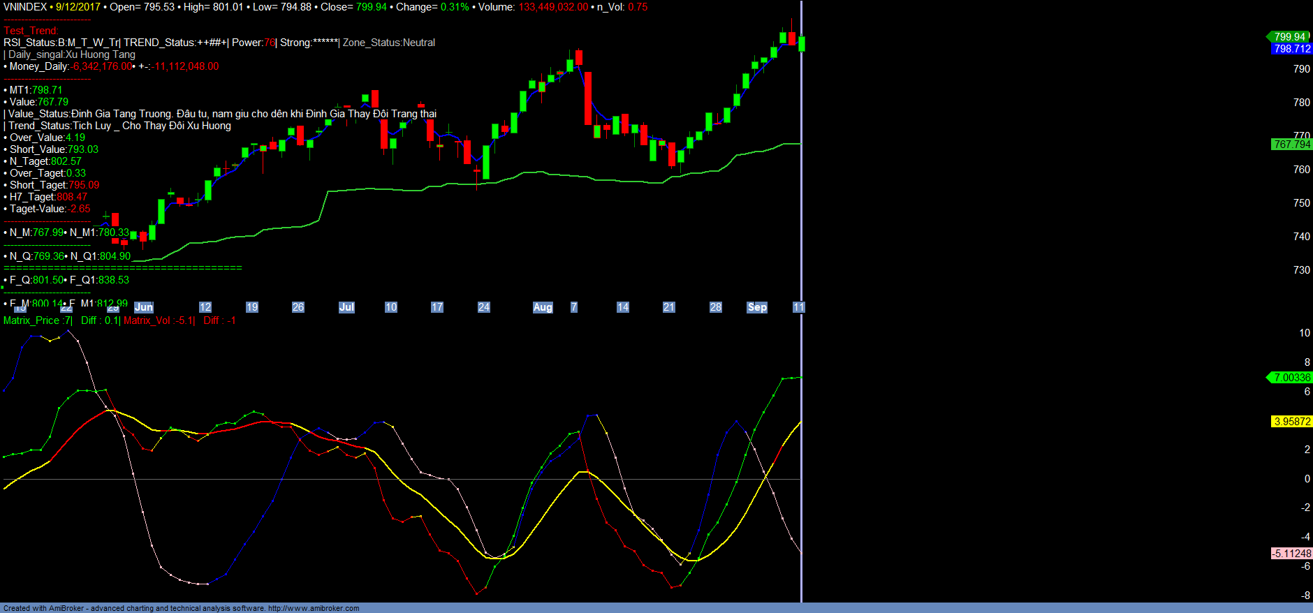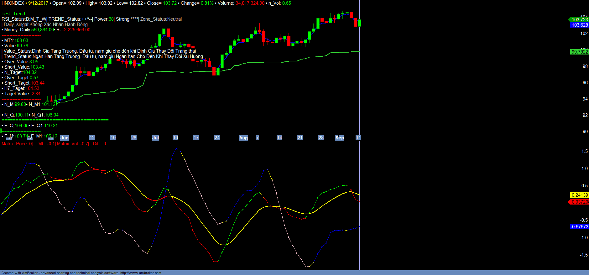 + Trong ngắn hạn với việc VNINDEX, VN30 liên tục tăng mạnh đã đi vào vùng quá mua ngắn hạn, dự kiến sẽ có rung lắc điều chỉnh, để kiểm tra lại hỗ trợ ngắn hạn, định giá tăng trưởng của VNINDEX và HNXINDEX hiện nay là 766+- và 99+-. Ngắn hạn nhà đầu tư có thể hạ tỉ trọng các nhóm mã đã tăng mạnh và ảnh hưởng chính đến VNINDEX, HNXINDEX và cover lại tại giá trị hỗ trợ ngắn hạn Short_value của các mã đấy. Trong và sau quá trình rung lắc, điều chỉnh của chỉ số INDEX mà chủ yếu là VN30 xảy ra, dư kiến nền tảng thanh khoản, money_in của thị trường sẽ được cải thiện trở lại, cũng như độ rộng, xu hướng Trend_up sẽ mở rộng qua các nhóm mã khác, nhất là các nhóm mã có xu hướng Định giá là tăng trưởng để đón đầu báo cáo kết quả kinh doanh Quí III chuẩn bị công bố. Nhà đầu tư lưu ý, giai đoạn cuối tháng 09/2017 đến đầu tháng 10/2017 hệ thống Matrix_Filter sẽ cập nhật định giá thị trường. Đối với các mã có xu hướng định giá Suy giảm, giá trị Định giá sẽ suy giảm, nhà đầu tư hạn chế tham gia vào các nhóm mã này. Chỉ tham gia vào các mã Định giá Tăng trưởng (Đối với các nhóm mã tăng trưởng mà hầu như không tăng giá trong thời gian gần 2-3 tháng vừa qua, Nhà đầu tư nếu có, vẫn nên tiếp tục kiên nhẫn nắm giữ trong quá trình rung lắc điều chỉnh của thị trường trong 1-2 tuần sắp đến để chờ thị trường định giá lại), hoặc Định giá Tích lũy chờ tín hiệu Tăng trưởng, cũng như chờ nhóm cổ phiếu VN30 điều chỉnh để mở rộng, gia tăng đầu tư. Danh mục mới đề xuất dự kiến sẽ cập nhật trong cuối tuần .