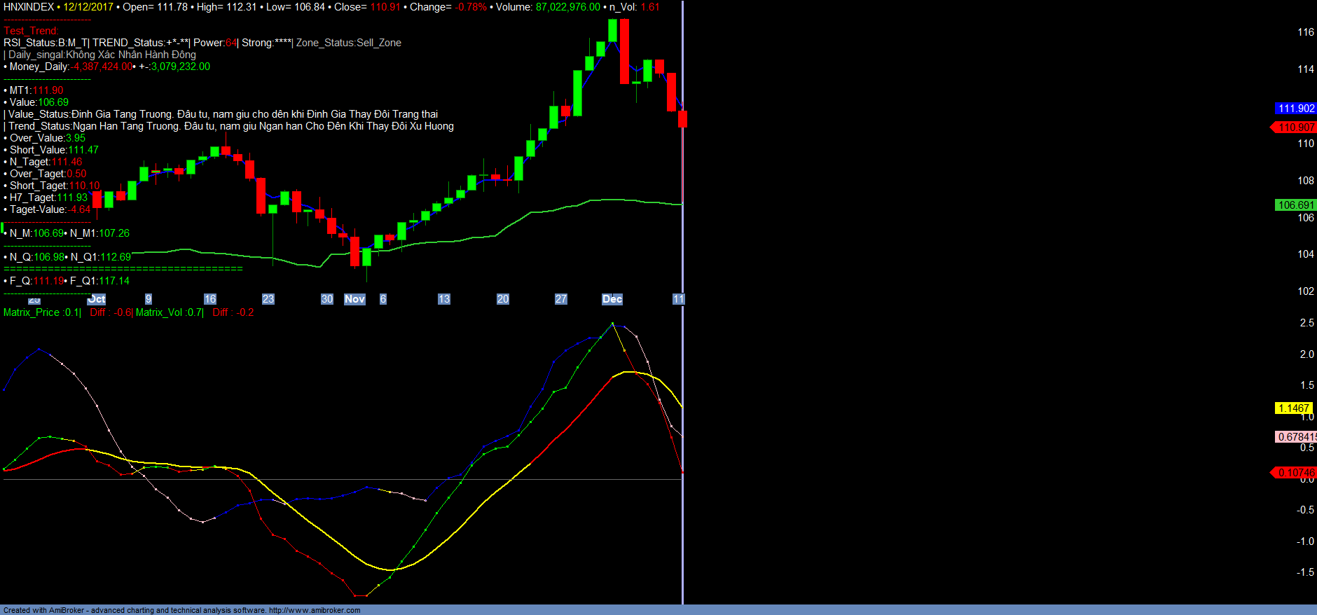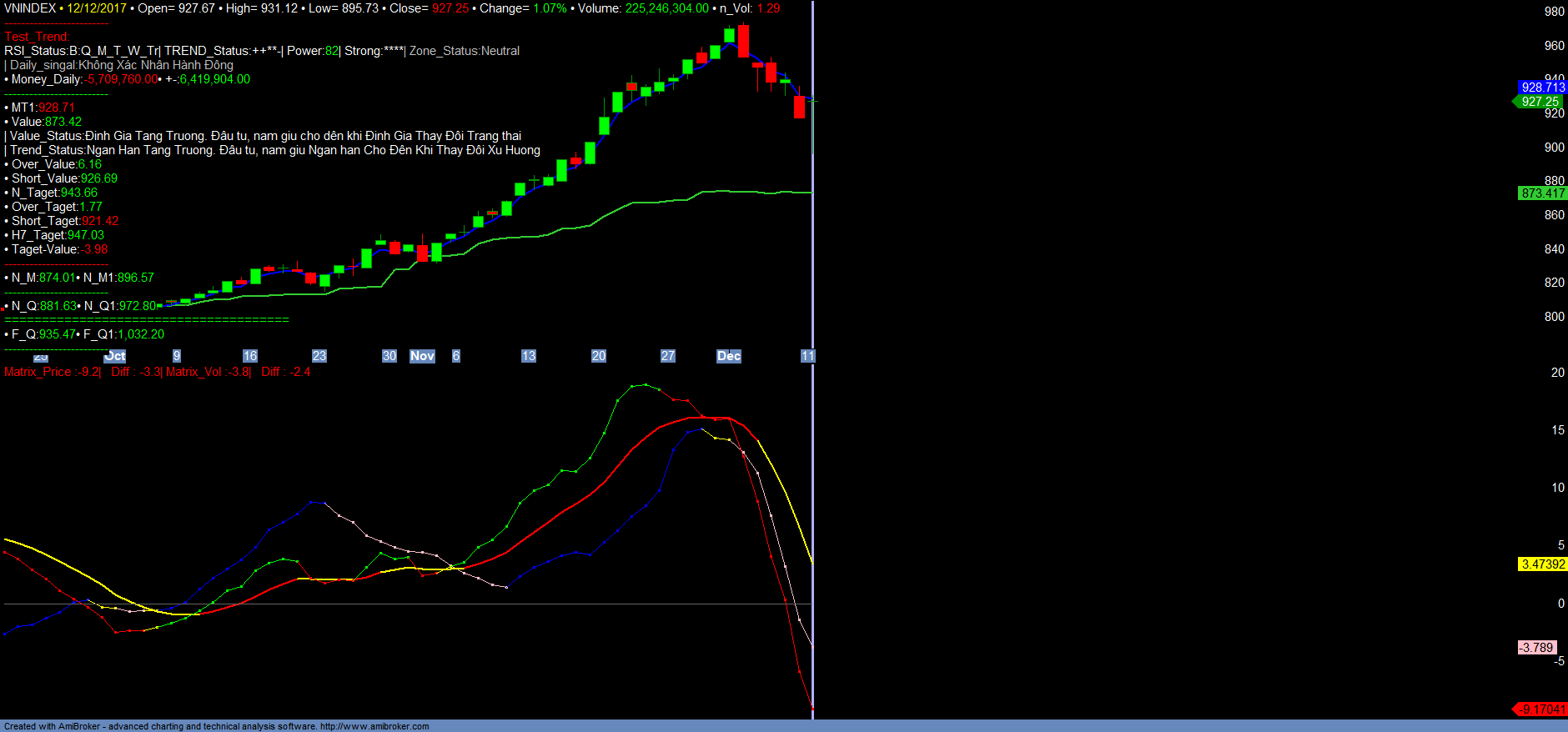 – VNINDEX đã điều chỉnh rất mạnh về vùng hỗ trợ tâm lý 900 và phục hồi tốt dưới ảnh hướng chính và nổi bật của nhóm cổ phiếu Dầu khí và Bia. Trong ngắn hạn, VNINDEX đang xác nhận 01 đáy 895.73 trong phiên giao dịch 12/12/2017. Tuy nhiên theo thống kê toàn thị trường dòng tiền Money_in vẫn chưa có dấu hiệu tăng trưởng trở lại, cũng như xu hướng Trend_up tiếp tục trở lại suy giảm. Khẳ năng sinh lợi của VNINDEX, VN30 trong ngắn hạn vẫn âm. Dự kiến trong thời gian đến VNINDEX chưa thể tiếp tục quay trở lại tăng trưởng mạnh mà vẫn sẽ tiếp tục điều chỉnh tích lũy để kiểm tra lại mốc 900. Do Trend_up vẫn tiếp tục suy giảm, vì vậy có thể VNINDEX trong thời gian đến sẽ không tiếp tục điều chỉnh sâu mạnh, nhưng thị trường vẫn có thể xảy ra tình trạng giảm hoặc có thể có tình trạng call magrgin các mã riêng biệt. Vị thế mở mua mới sẽ không đảm bảo sinh lợi cho T+3. Nhà đầu tư nên tiếp tục cơ cấu danh mục. Hạn chế mở vị thế giao dich ngắn hạn mới cho đến khi có dấu hiệu dòng tiền phục hồi trở lại. Thời điểm hiện nay phù hợp cho vị thế quan sát, để tìm kiếm các tín hiệu tăng trưởng mạnh cho danh mục đầu tư mở rộng cho năm tài khóa tiếp theo. Danh mục đề xuất đầu tư mới sẽ sẽ được xem xét mở rộng cho đến khi có những dữ liệu đánh giá chính xác hơn trong thời điểm cuối năm. Chi tiết tham khảo Matrix_Fiter và các Danh mục.