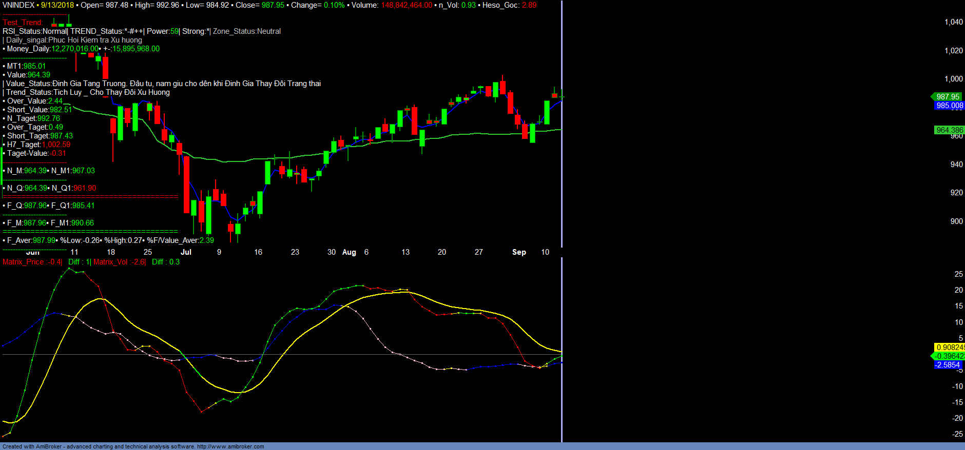 + VNINDEX tiếp tục rung lắc và điều chỉnh trở lại vùng kháng cự đã vượt 980-982. Số lượng mã vào vùng mua, dòng tiền ngắn hạn vẫn gia tăng. Nội tại thị trường vẫn duy trì tăng trưởng tốt. Dòng tiền xoay tua liên tục qua nhiều mã, nhóm mã khác trong ngắn hạn. Ngắn hạn dự kiến VNINDEX sẽ tiếp tục tích lũy trong vùng 980-990 trong 2-5 phiên tới. Sau đó sẽ vượt được mốc tâm lý 1000 hướng đến mục tiêu 1030-1045 và dự kiến sẽ tạo đỉnh trong vùng này. Tín hiệu tạo đỉnh sẽ được xác nhận vả cảnh báo khi các thống kê dòng tiền và xu hướng xác nhận.