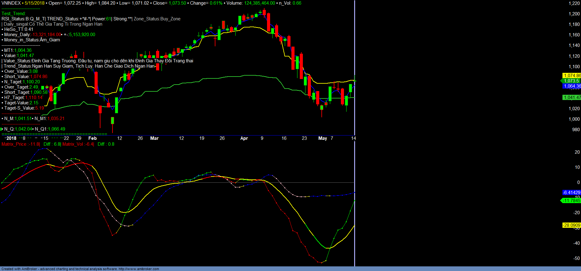 + Trung hạn vẫn đang tích lũy trong kênh với biên độ kênh dưới 1000-1020 và 1100-1120. Thời gian tích lũy trung hạn vẫn dự kiến kéo dài đến cuối tháng 06/2018 mới kết thúc tích lũy và xác nhận tốc độ tăng trưởng trung dài hạn tiếp theo. Thị trường trong giai đoạn hiện nay phù hợp đầu cơ giao dịch lướt sóng ngắn hạn, tích lũy tạo nền trung hạn cũng như cơ cấu, chọn lọc danh mục đầu tư mới. Ngắn hạn nhà đầu tư vẫn có thể giao dịch đầu cơ các nhóm mã có vùng mua như trên. Thời điểm tốt nhất để gia tăng vị thế đầu tư tăng trưởng mới là trong tháng 06/2018 khi xu hướng ngắn hạn Short_value tăng trưởng trở lại, cũng như VNINDEX xác nhận được nâng bậc Xếp hạng tăng trưởng lên lại 3(*) và kiểm tra thành công. Các vị thế mở mua đầu tư mới sẽ được cập nhật mới liên tục trong Danh mục Đề xuất. Chi tiết tham khảo các Danh mục.