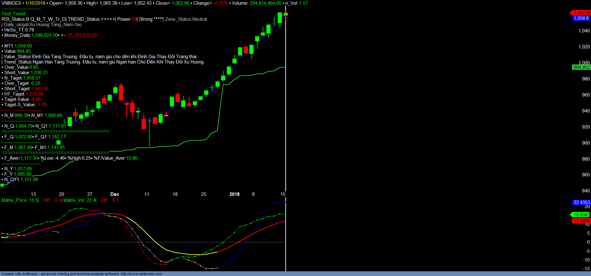+ VNINDEX và VN30 tiếp tục lập đỉnh cao mới, tuy nhiên khối lượng giao dịch bắt đầu giảm. Dòng tiền của VN30 đang có tín hiệu lập đỉnh. Mức độ over giá trị của VN30 vẫn cao, VN30 đại diện cho chỉ số VNINDEX cần tích lũy, điều chỉnh về vùng giá hợp lý cũng như chờ thị trường nâng mức định giá tiếp theo. Tiếp tục dừng vị thế mua đối với chỉ số VN30. Thị trường tiếp tục phân hóa, dòng tiền vẫn luân chuyển và tập trung mạnh vào các mã kỳ vọng tăng trưởng mạnh trong tương lai cũng như có kết quả kinh doanh Quí 4/2017 tích cực. Vẫn tiếp tục xuất hiện các mã rất mạnh, vào trend mới, cũng như các mã đạt chuẩn test xu hướng tăng trưởng thành công. Nhà đầu tư cân đối danh mục, có thể hạ tỉ trọng ngắn hạn các mã tăng mạnh vào vùng bán, cơ cấu vào các mã đang có xu hướng tăng trưởng mạnh, đạt chuẩn test tăng trưởng cũng như vào xu hướng tăng mới. Ưu tiên các mã có hệ số tăng trưởng tốt hơn chỉ số VNINDEX. Tỉ trọng đầu tư vẫn nắm giữ theo xu hướng tăng trưởng ngắn hạn. Chi tiết tham khảo Matrix_Filter và các Danh Mục.