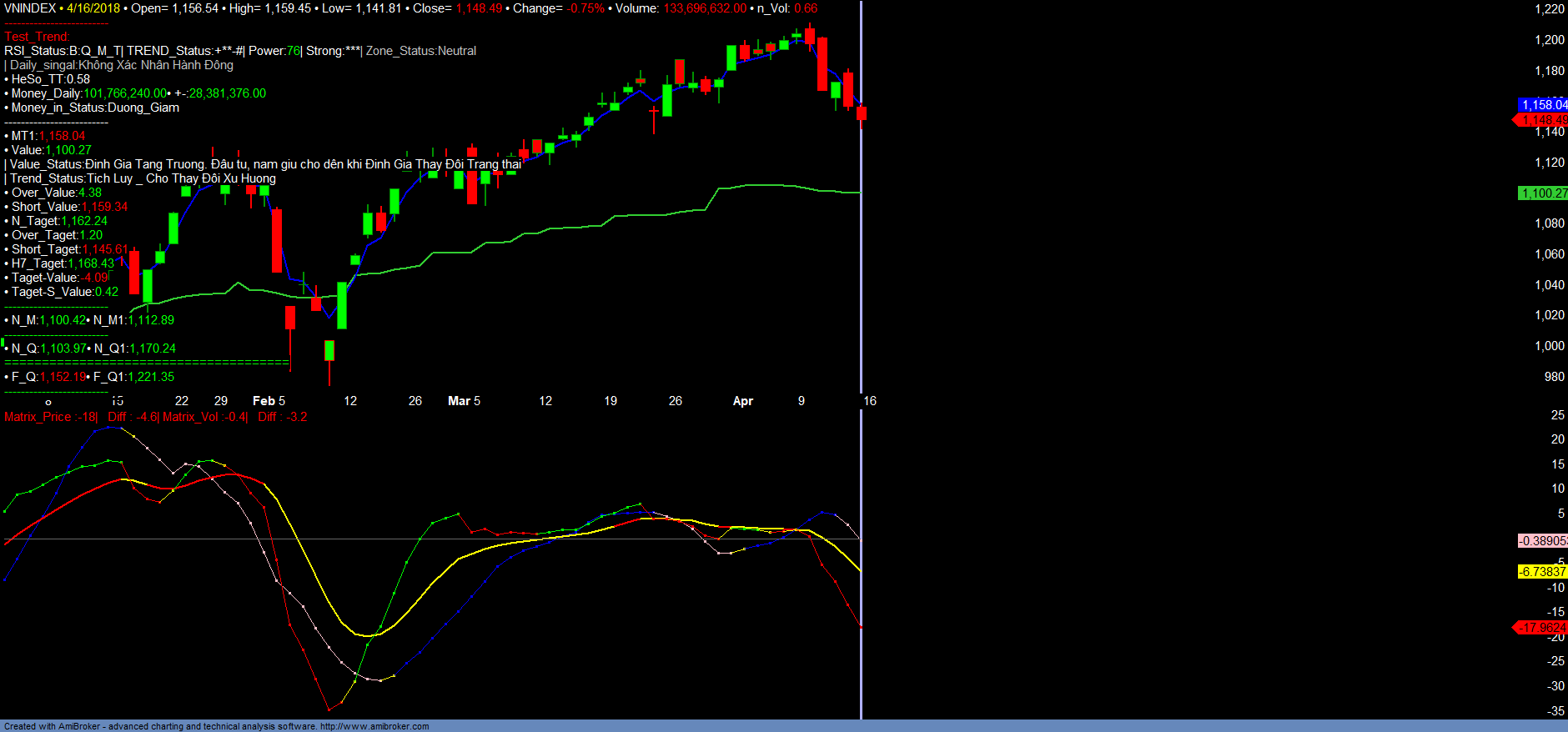 + VNINDEX tiếp tục bị hạ bậc xếp hạng tăng trưởng Strong và mất mốc hỗ trợ tâm lý 1150. Dự kiến trong 2-4 phiên tiếp theo thị trường sẽ có nhịp hồi ngắn ở hỗ trợ tiếp theo là 1130-1135 tương ứng giá trị cao nhất tháng 02/2018. Thị trường bắt đầu phân hóa, tuy nhiên do nền tảng thanh khoản kém và dòng tiền vẫn chưa có dấu hiệu tạo đáy, vì vậy nhịp phục hồi vẫn chưa được đánh giá cao. Bên cạnh đó các chỉ số Phái sinh VN30F đều đã mất vùng đỉnh cũ tháng 2/2018. Nhà đầu tư tiếp tục rà soát , cơ cấu danh mục đầu tư với các mã đã chuyển sang xu hướng Tích lũy ở các nhịp hồi phục. Các vị thế mua mới vẫn không bảo đảm khẳ năng sinh lợi trong T+3. Vị thế mua mới và danh mục sẽ được cập nhật khi có tín hiệu Dòng tiền Money_in tạo đáy tăng trưởng trở lại. Chi tiết tham khảo các Danh Mục.