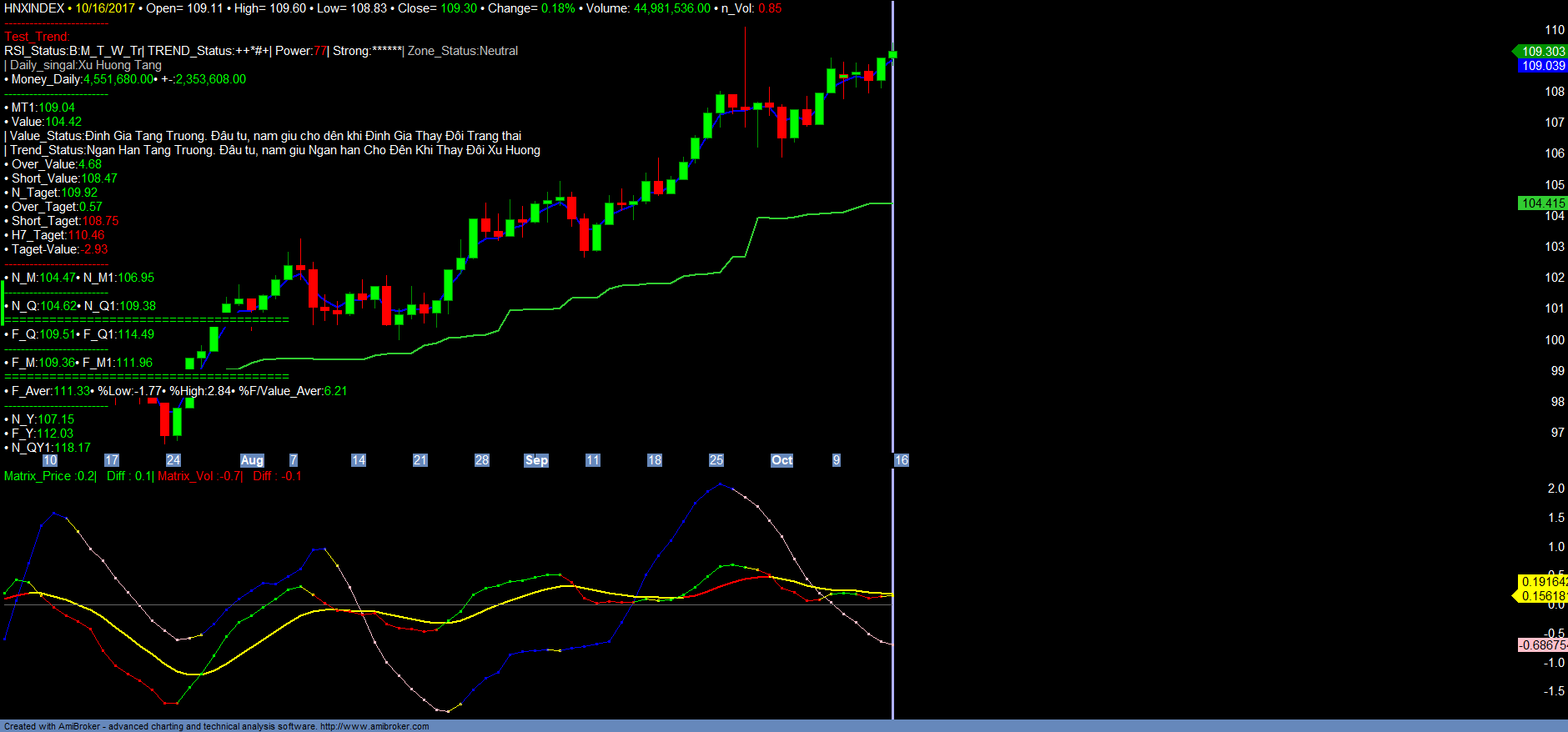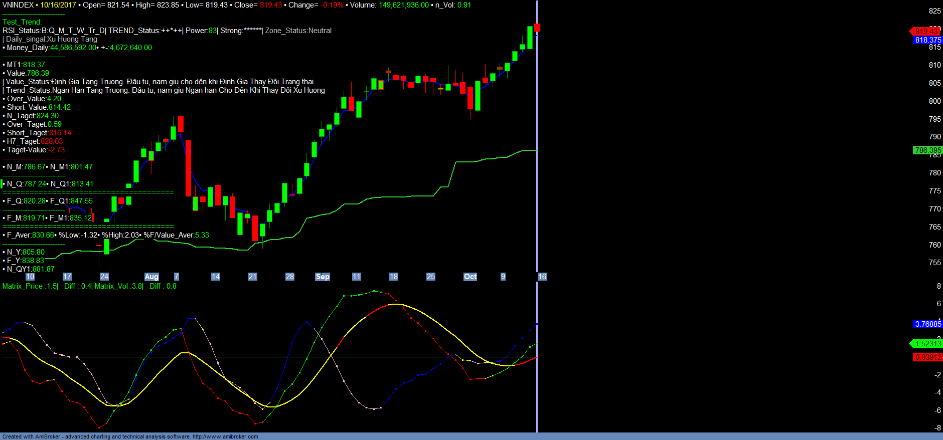 + Về thị trường chung mặc dù HNXINDEX đã và đang xác nhận chu kỳ tăng trưởng dài hạn mới, nhưng hiện HNXINDEX có kháng cự rất mạnh tại vùng 110-112, tương ứng với ACB là vùng kháng cự đỉnh cũ 32.5-33.2, nên HNXINDEX đang điều chỉnh tích lũy. Đối với VNINDEX dưới ảnh hưởng của VN30 tiếp tục tăng lên vùng kháng cự hiện nay là 817-820. Hiện nay các tín hiệu kỹ thuật cũng đang đi vào vùng quá mua ngắn hạn cũng vì vậy hạn chế mua đuổi tại vùng giá này đối với chỉ số HNXINDEX và VNINDEX. Có thể cơ cấu danh mục ngắn hạn qua các mã có xu hướng ngắn hạn chuyển từ tích lũy sang Tăng trưởng trong danh mục Trend mới. Chi tiết tham khảo Matrix_Fiter và các Danh mục.