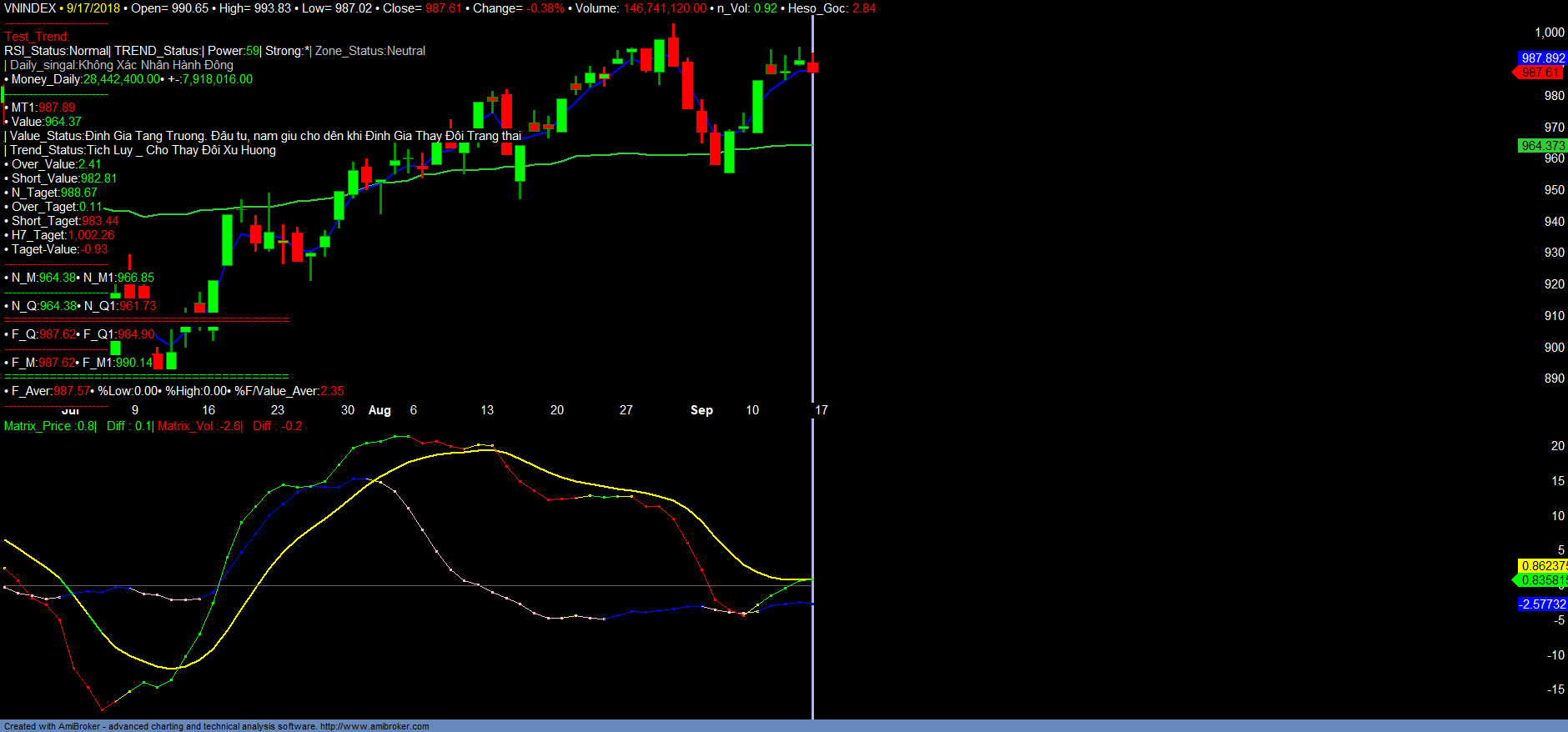 + VNINDEX giảm điểm để tiếp tục kiểm tra lại vùng hỗ trợ 980-982 dưới ảnh hưởng chính của VN30 và đang tạo thành kênh tích lũy trong biên độ hẹp 980-1000 để chờ thị trường chốt NAV quí III/2018. Thị trường tiếp tục phân hóa mạnh khi rất nhiều nhóm mã vẫn tăng điểm tốt như dầu khí PVD, PVS,.. hay khu công nghiệp LHG, NTC… bất động sản, xây lắp như HDG, TV2.. hay như FMC, VHC, ANV, PHR… tiếp tục tăng mạnh. Tuy nhiên đa phần các mã này đang gần đi đến vùng kháng cự hay taget xem xét chốt lãi ngắn hạn. Trong khi đó áp lực bán mạnh đến từ các mã vào vùng bán trong VN30 như nhóm ngân hàng hay VIC, VJC…