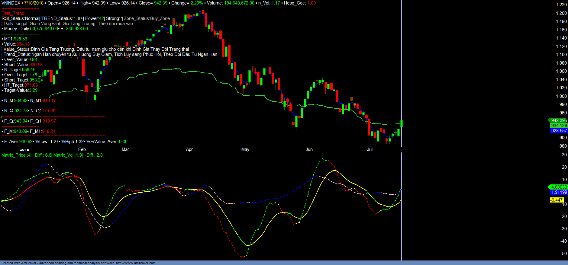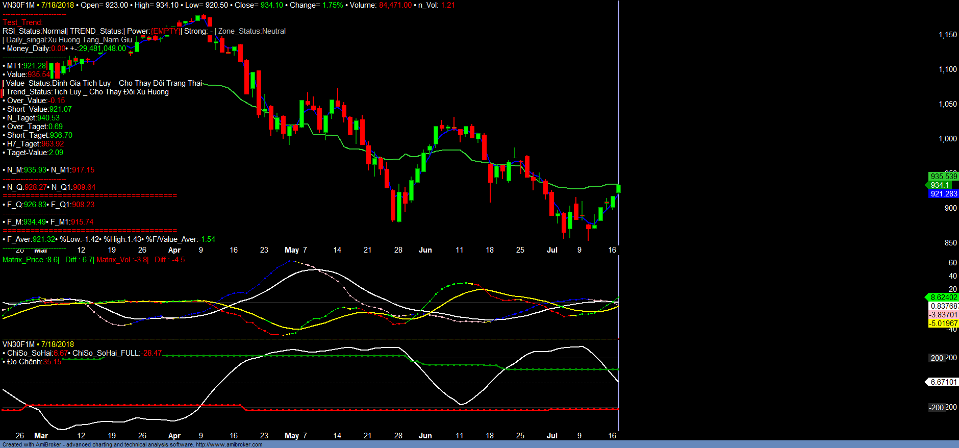 + VNINDEX, VN30 tiếp tục duy trì xu hướng tăng lên 942. Khối lượng VNINEX tăng 35,47%, VN30 tăng 23,83%. Điều này cho thấy dòng tiền gia tăng mạnh ở các nhóm mã ngoài VN30, nổi bật với các mã như VCG, DIG, PVD, CVT, HBC, ASM, PPC…. Các mã có khối lượng giao dịch đột biến như HNG, HAG, PPC, CVT, DIG, ITQ, VNP, VCG…, VNINDEX bắt đầu đi vào vùng giá kháng cự 945-946 tương ứng trend_line giảm giá trung hạn nối từ đỉnh 1211 ngày 10/04/2018 và 1033 ngày 11/06/2018 đồng thời là kháng cự của phiên giảm giá mạnh ngày 03/07/2018 từ 945-946 về 906. Dự kiến với xung lực và dòng tiền tiếp tục tăng vượt trend kháng cự để hướng đến mục tiêu 950-953. Đà tăng của ngắn hạn VNINDEX vẫn tiếp tục duy trì trong 2-4 phiên tiếp với mức độ Over khoảng 3-4% sau đó quay trở lại tích lũy điều chỉnh kiểm tra lại vùng định giá 930-940.