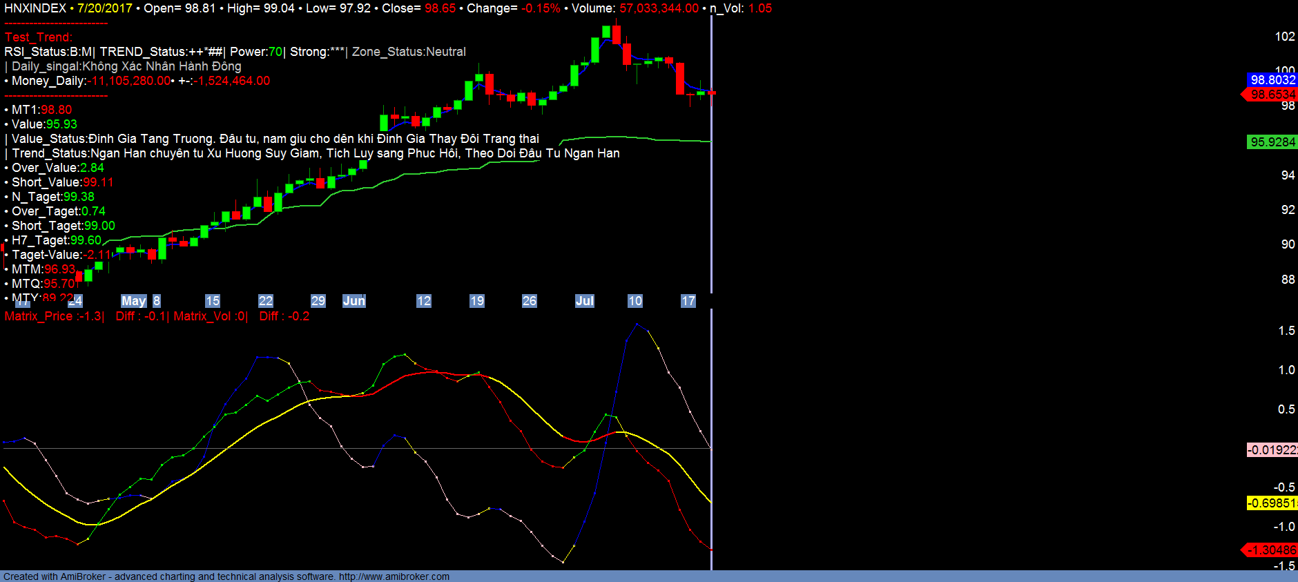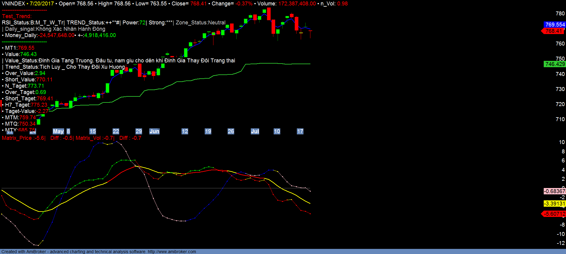 + Trend_up giảm, Money_in giảm mạnh. Mặc dù trong ngắn hạn VNINDEX đã 3 lần chạm vùng 761-763 tuy nhiên thống kê thị trường chung vẫn chưa thấy tín hiệu tích cực. Dòng tiền vẫn suy yếu. Để bảo đảm an toàn cho vị thế mua mới, nên chờ các tín hiệu tích cực hơn, nhất là tín hiệu Lượng đi trước giá -Money_in tăng vượt Trend_up trong ngắn hạn.