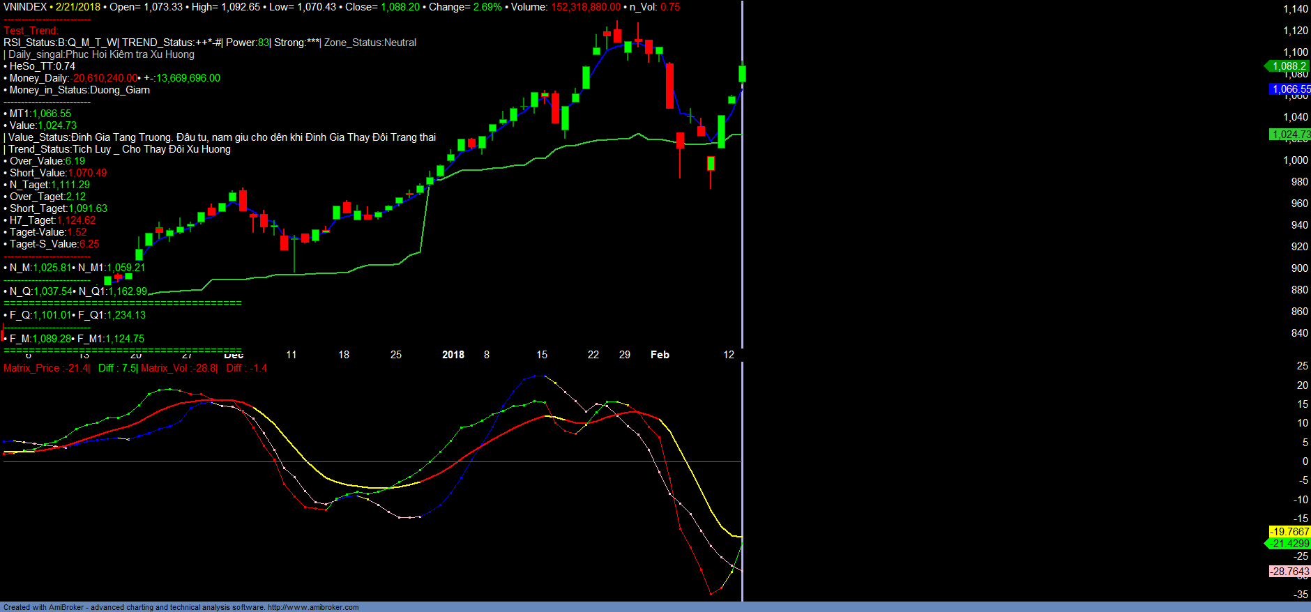 + VNINDEX sau 02 lần điều chỉnh mạnh về kiểm tra lại vùng đỉnh cũ 974-980 tháng 12/2017 cũng như vùng định giá tăng trưởng đã phục hồi trở lại, dự kiến kiểm tra lại vùng đỉnh cũ 1120-1130 vừa qua. Nhóm mã mạnh nhất thị trường hiện nay vẫn là nhóm mã Ngân hàng, điển hình như ACB, VPB… đã vượt đỉnh cũ ngắn hạn vửa qua. Dòng Bất động sản với VIC cũng đã vượt giá trị đỉnh cũ trước đây. Đây cũng là nhóm mã dự kiến sẽ tiếp tục có xu hướng tăng trưởng mạnh. Dòng Chứng khoán, dự kiến SSI sẽ thay thế HCM để dẫn dắt và cho tín hiệu vượt đỉnh cũ tiếp theo. Tuy nhiên do nền tảng thanh khoản vẫn duy trì ở mức 170-200tr/VNINDEX . Dòng tiền phân hóa, tín hiệu dòng tiền Money_in của đa số các mã, nhóm mã tăng trưởng mạnh nhất đều chuyển sang dạng tích lũy. Chỉ có 1 số ít mã có dòng tiền vào như VPH. Vì vậy, vị thế mua ngắn hạn chỉ nên kỳ vọng phục hồi kiểm tra lại vùng đỉnh cũ trước đây. Lưu ý, vì thị trường phân hóa mạnh, nhà đầu tư ưu tiên tham khảo giao dịch các mã trong Danh Mục Tăng Trưởng. Chi tiết tham khảo các Danh Mục.
