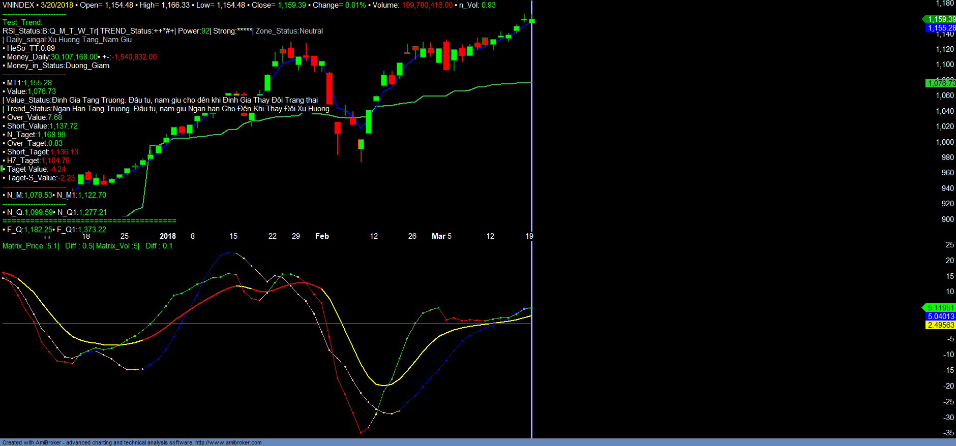 + Dự kiến với chỉ số VNINDEX sẽ tiếp tục hướng đến 1179,32 và có thể vượt đỉnh cũ trong đầu tháng 04/2018 hướng đến mục tiêu dự kiến là 1190-1210 và có thể tạo đỉnh ngắn hạn tạo vùng này. Tín hiệu dòng tiền ngắn hạn Money_in đang có tốc độ tăng trưởng chậm dần sau thời gian tăng trưởng từ tháng 02/2018. Vì vậy giai đoạn sắp đến là giai đoạn ưu tiên chuẩn bị tái cơ cấu danh mục ngắn hạn. Hạ tỉ trọng margin nếu có với các mã vào vùng bán và chờ thị trường chốt NAV quí 01/2018 để xác định mức độ tăng trưởng, định giá tăng trưởng. Cũng như xác định cập nhật thêm danh mục đầu tư tăng trưởng mạnh cho giai đoạn tiếp theo. Chi tiết tham khảo các Danh Mục.