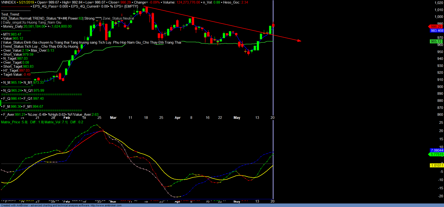 + VNINDEX điều chỉnh nhẹ về mức 986,29 và tiếp tục được nâng mức xếp hạng tăng trưởng, đồng thời gia tăng sức hỗ trợ mạnh của vùng 975-980. VN30 như khuyến nghị hạn chế mua đuổi khi tiến vào trend_line giảm giá trung dài hạn 910+- đã chịu áp lực rung lắc, chốt lời ngắn. Như đã phân tích, hiện tại các thông số đều chưa đưa ra dự báo nào sẽ vượt. Dự kiến VN30 cần tích lũy tiếp tục trong biên độ hẹp với hỗ trợ mạnh 890-895 vả vùng kháng cự trend_line 910+- trong những phiên đến.