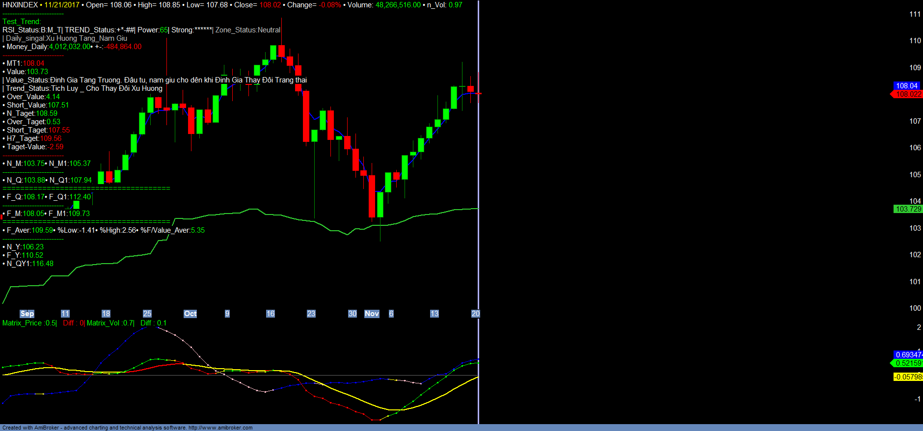– VNINDEX vẫn tiếp tục tín hiệu tăng trưởng Strong_trend dưới ảnh hưởng của VN30. VNINDEX có mốc tâm lý là 927,02 giá đóng cửa năm 2007. Mặc dù qui mô thị trường năm 2007 còn kém, tuy nhiên đây cũng là mốc tâm lý kỹ thuật mạnh cần quan tâm trong thời điểm VN30 liên tục tăng mạnh, đi vào vùng Over mạnh. VN30 sau 02 phiên giao dịch phát đi tín hiệu dòng tiền suy giảm thì phiên 21/11/2017 đã bất ngờ tăng mạnh và đã xảy ra hiện tượng chốt lời ngắn hạn mạnh với khối lượng giao dịch tăng đột biến 73,8tr cổ phiếu, tương ứng với khối lượng chốt trong phiên chiều từ mốc 923.57 về 910 khoảng 50tr cổ phiếu. Như vậy, ngắn hạn tạm thời VN30 đang có 01 đỉnh ngắn hạn 923.57. Vì vậy đây là thời điểm cân nhắc chốt lãi ngắn hạn VN30 nếu có. Vị thế mua mới đối với VN30 cũng như các mã có tín hiệu dòng tiền suy yếu là không được khuyến nghị mở thêm cho đến khi có tín hiệu Money_in tăng trưởng trở lại. VN30 vẫn tiếp tục tăng trưởng mạnh trong dài hạn. Ngắn hạn do vượt quá cao giá trị định giá, VN30 cần điều chỉnh tích lũy để chờ định giá tăng trưởng cũng như xác nhận lại mức kỳ vọng tăng trưởng mới của thị trường. Thời điểm quan trọng để Định giá lại thị trường cũng như xác nhận các cơ hội tăng trưởng mạnh mới là thời điểm cuối năm. Do đó MatrixBuysell sẽ hạn chế khuyến nghị mở thêm vị thế đầu tư cũng như danh mục đề xuất mới cho đến khi chốt NAV 2017. Nhà đầu tư vẫn tiếp tục duy trì danh mục các mã tăng trưởng mạnh, có thể cơ cấu danh mục, duy trì tỉ trọng danh mục hợp lý để chờ xác nhận các cơ hội đầu tư tăng trưởng mạnh trong thời gian đến. Chi tiết tham khảo Matrix_Fiter và các Danh mục.