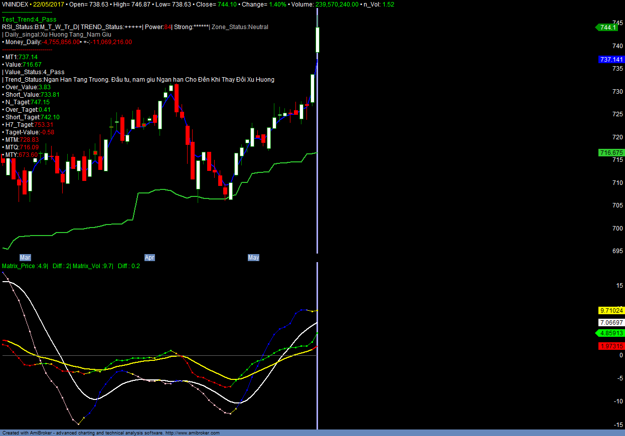 + Xu hướng tăng Trend_Up có dấu hiệu suy giảm ở phiên giao dịch 19/05/2017 đã bắt đầu suy giảm và chủ yếu tập trung vào nhóm mã BDS đã tăng khá mạnh. Toàn thị trường áp lực bán chốt lãi và điều chỉnh ngắn hạn rất lớn