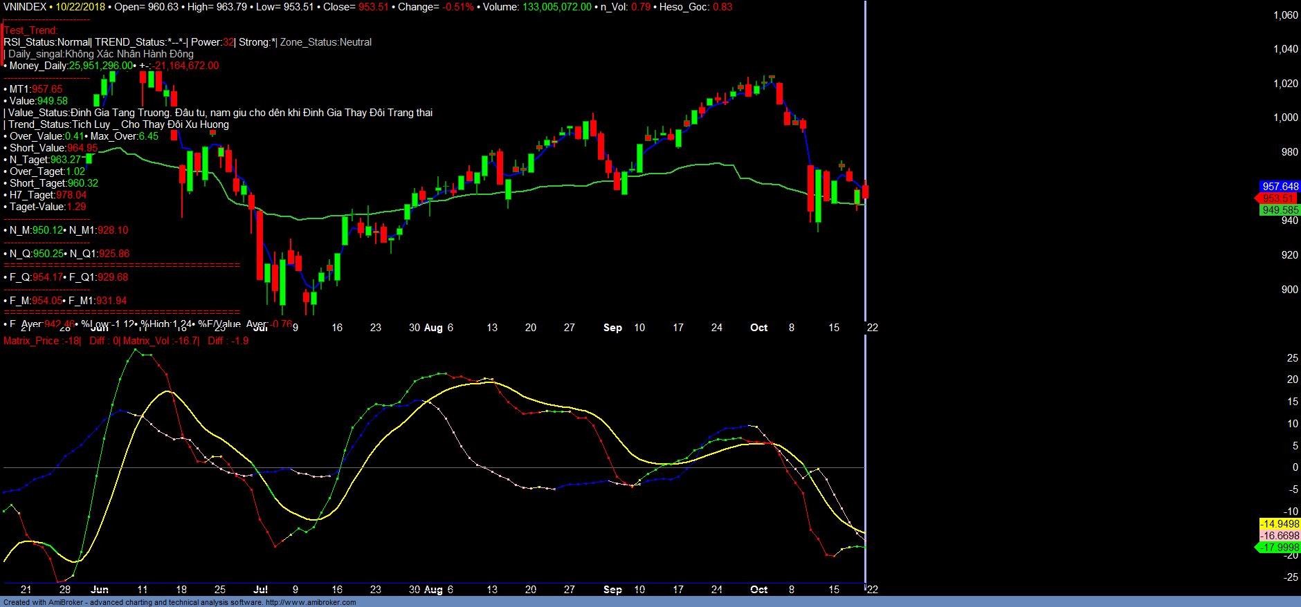 + VNINDEX giảm điểm, áp lực giảm đến từ VN30. Nhóm mã ngân hàng vẫn suy yếu, VCB khẳ năng mất vùng hỗ trợ 57, nhiều mã giảm mạnh, so với vùng giá tương đương VNINDEX 935+- ngày 11-12/10/2018 tiếp tục tạo tâm lý tiêu cực cho thị trường, cũng như xảy ra tình trạng call magrin riêng lẽ từng mã. Thanh khoản vẫn thấp, dòng tiền và khẳ năng sinh lợi vẫn tiếp tục suy giảm. Do đó để xem xét gia tăng, mở rộng vị thế đầu tư trở lại, nhà đầu tư cần phải chờ xu hướng Ngắn hạn Short_value xác nhận tăng trưởng. Kiên nhẫn chờ Trend_up, Money_in xác nhận tạo đáy và quay trở lại xu hướng tăng, cũng như nhóm largecaps, dòng bank xác nhận vùng đáy trung hạn. Nhà đầu tư nên tiếp tục cơ cấu danh mục, bán các mã suy yếu nếu có, tích lũy cổ phiếu cho chu kỳ đầu tư mới khi thị trường điều chỉnh trở lại với tín hiệu dòng tiền tăng mạnh hơn. Ưu tiên nhóm mã tăng trưởng hưởng lợi từ căng thẳng và dịch chuyển thương mại như Khu Công nghiệp, cảng biển, dệt may, xây lắp hạ tầng. Danh mục đề xuất đầu tư sẽ được theo dõi và cập nhật mới. Chi tiết tham khảo các Danh mục.