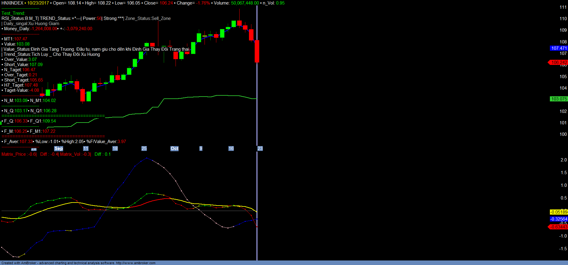 + Thống kê thị trường: Trend_up giảm, Money_in giảm. Thị trường đã điều chỉnh mạnh, sau một thời gian tăng trưởng kéo dài và vượt khá xa giá trị định giá, đồng thời HNXINDEX cũng đã gặp siêu kháng cự mạnh 110-112 như đã phân tích ở các bản tin trước đây. Đây là điều bình thường và sẽ phải xảy ra. Hiện nay xu hướng tăng trưởng ngắn hạn của HNINDEX từ vùng giá 78-82 bắt đầu từ tháng 12/2016 cho đến nay đang bắt đầu cho tín hiệu kết thúc, để chuyển sang giai đoạn điều chỉnh tích lũy, kiểm tra lại xu hướng tăng của Định giá. Dự kiến HNINDEX sẽ điều chỉnh kiểm tra lại vùng giá 103+-, và tích lũy tạo nền có thể kéo dài 01-02 tháng. Vì vậy, trong ngắn hạn, nhà đầu tư xem xét cơ cấu danh mục, hạ tỉ trọng ngắn hạn, cho đến khi HNXINDEX có tín hiệu Test Trend tăng trưởng thành công. Các mã hiện có xu hướng ngắn hạn suy giảm hoặc tích lũy thì nhà đầu tư nên xem xét cơ cấu, cân đối danh mục. Đối với các nhà đầu tư đã cân đối, tỉ trọng danh mục hợp lý, thì nên kiên nhẫn chờ tín hiệu cho đến khi HNINDEX test Trend thành công, để chọn lọc danh mục tăng trưởng mới, mạnh cho năm đầu tư 2018. Chi tiết tham khảo Matrix_Fiter và các Danh mục.