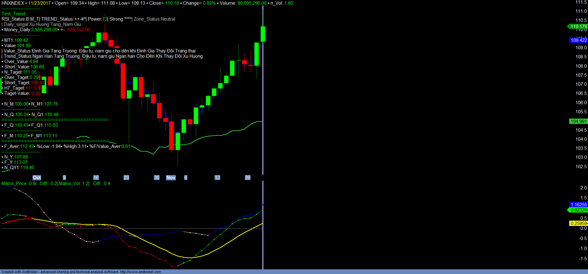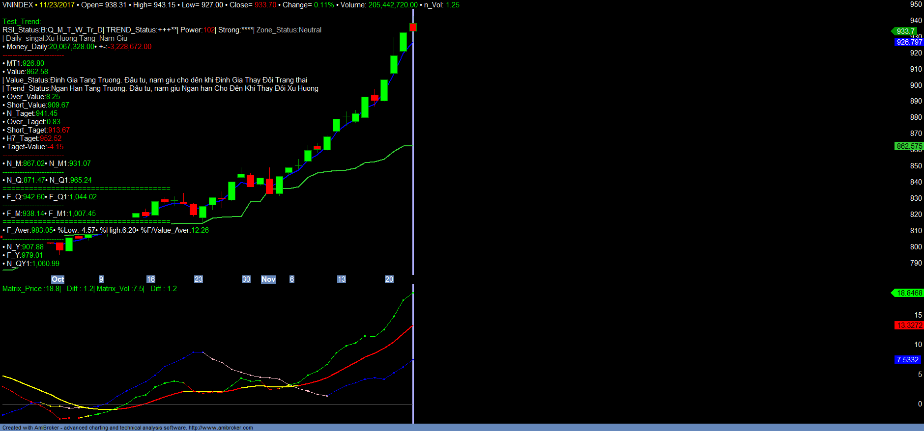– VNINDEX vẫn tiếp tục tín hiệu tăng trưởng Strong_trend dưới ảnh hưởng của VN30. VN30 liên tục tăng mạnh, đi vào vùng Over mạnh. Sau khi tạo đỉnh ngắn hạn tạm thời 923,57 ngày 21/11/2017 với áp lực bán hơn 22tr cổ phiếu VN30 chỉ trong 01h giao dịch chiều 21/11/2017. Phiên giao dịch 23/11/2017 cũng xuất hiện tình trạng bán mạnh tương tự hơn 23tr trong 01h phiên chiều. Như vậy, VN30 đã và đang tạo 01 đỉnh ngắn hạn vùng 923.57- 933, tương ứng với mốc Over giá trị Định giá mới là hơn 8-8.5%. Vì vậy đây là thời điểm cân nhắc chốt lãi ngắn hạn VN30 nếu có. VN30 vẫn tiếp tục tăng trưởng mạnh trong dài hạn. Ngắn hạn do vượt quá cao giá trị định giá, VN30 cần điều chỉnh tích lũy để chờ định giá tăng trưởng cũng như xác nhận lại mức kỳ vọng tăng trưởng mới của thị trường. Thời điểm quan trọng để Định giá lại thị trường cũng như xác nhận các cơ hội tăng trưởng mạnh mới là thời điểm cuối năm. Trong khi đấy HNXINDEX đại diện chính cho nhóm mã midcap, penny, đầu cơ vẫn tiếp tục duy trì đà tăng và dòng tiền dịch chuyển tham gia trở lại tốt. Dự kiến HNXINDEX sẽ sớm vượt đỉnh cũ 110.89. Vì vậy nhà đầu tư vẫn có thể mở rộng vị thế mua ngắn hạn , đầu cơ đối với các mã đạt vùng mua, ưu tiên các mã tăng trưởng toàn diện và có tín hiệu Test_Trend thành công. MatrixBuysell sẽ hạn chế khuyến nghị mở thêm vị thế đầu tư cũng như danh mục đề xuất mới cho đến khi chốt NAV 2017. Nhà đầu tư vẫn tiếp tục duy trì danh mục các mã tăng trưởng mạnh, có thể cơ cấu danh mục, duy trì tỉ trọng danh mục hợp lý để chờ xác nhận các cơ hội đầu tư tăng trưởng mạnh trong thời gian đến. Chi tiết tham khảo Matrix_Fiter và các Danh mục.