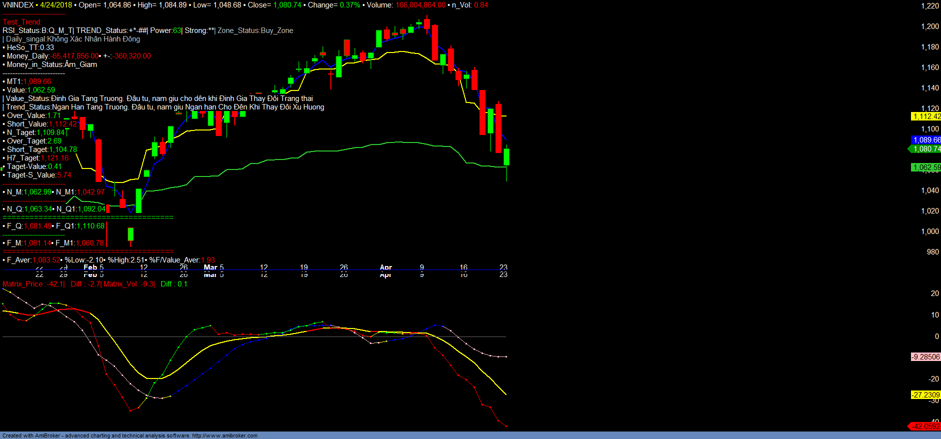 + Trend_up giảm, Money_in tăng. Thị trường đã hồi phục tại vùng 1050+- tương ứng vùng hỗ trợ tăng trưởng dài hạn. Dòng tiền ngắn hạn tăng. Khẳ năng sinh lợi toàn thị trường tiếp tục giảm.