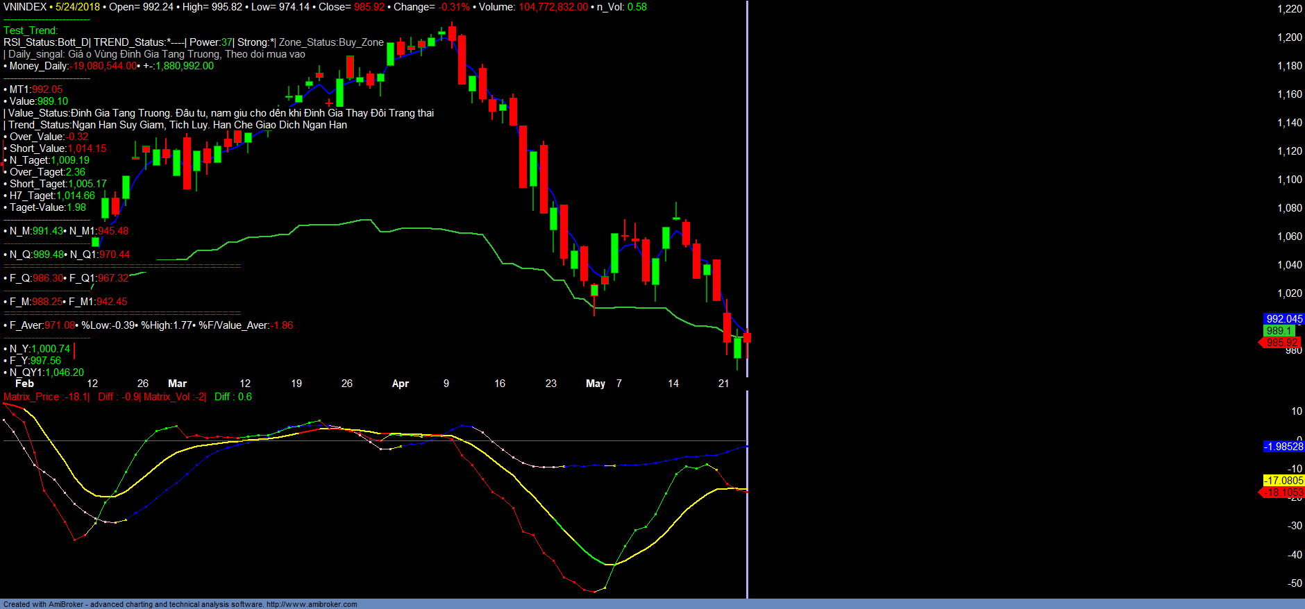 + VNINDEX dưới ảnh hưởng của cổ phiếu VHM có mức giảm tốt hơn và vẫn giữ được hỗ trợ quan trọng 980-985. Vẫn chưa thể khẳng định đáy về chỉ số, vì áp lực bán luân phiên của các cổ phiếu Bule. VN30 vẫn rất mạnh và chưa thể kiểm soát. Tuy nhiên xét trên tổng thể toàn thị trường, ngắn hạn dòng tiền luân chuyển trong ngày và lực cầu của toàn thị trường đã cải thiện và bắt đầu dương trở lại. Trung bình lệnh đặt Mua đã bắt đầu tăng trong những phiên gần đây. Thị trường vẫn chịu áp lực bán mạnh, nhưng trong ngắn hạn đã bắt đầu có tín hiệu Lượng đi trước giá. Cần chờ đợi tín hiệu Giá Trend_up tăng, Vol tăng xác nhận đồng thuận trở lại để xác nhận VNINDEX sẽ phục hồi trở lại vùng 1020-1030.