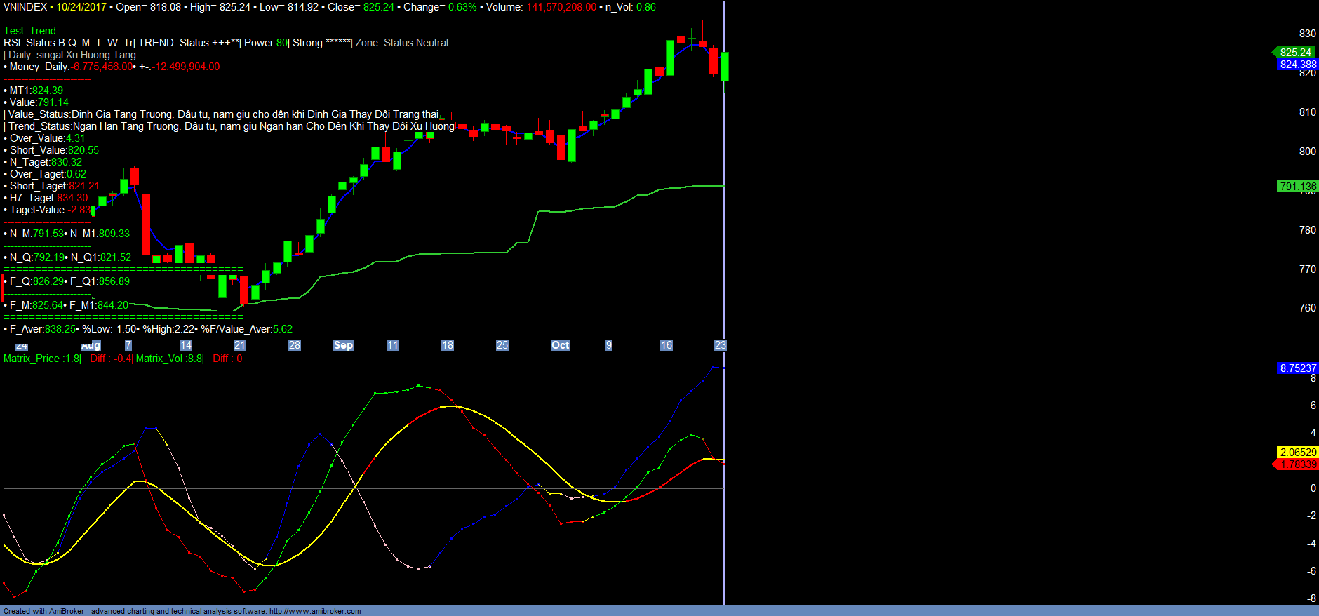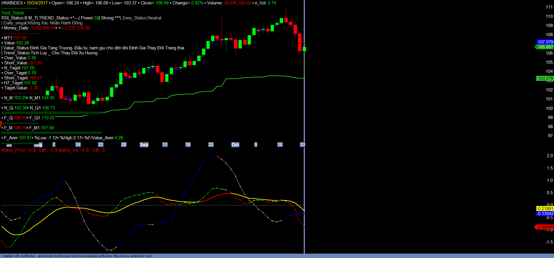 + Thống kê thị trường: Trend_up giảm, Money_in giảm. Hiện nay xu hướng tăng trưởng ngắn hạn của HNINDEX từ vùng giá 78-82 bắt đầu từ tháng 12/2016 cho đến nay đang bắt đầu cho tín hiệu kết thúc, để chuyển sang giai đoạn điều chỉnh tích lũy, kiểm tra lại xu hướng tăng của Định giá với định giá hiện nay là 103+-. Trong phiên giao dịch 23/10/2017, HNX đã có thời điểm giảm về 103.37 rồi phục hồi, tuy nhiên đây chỉ là hành động vẽ nến kỹ thuật. Hiện nay xu hướng ngắn hạn của HNXINDEX là tích lũy chờ thay đổi xu hướng sau giai đoạn tăng trưởng, cũng như hồi phục kiểm tra lại giá trị ngắn hạn Short_value. Dự kiến HNINDEX vẫn sẽ điều chỉnh kiểm tra lại vùng giá 103+-, và tích lũy tạo nền để chờ thay đổi xu hướng ngắn hạn. Vì vậy, trong ngắn hạn, nhà đầu tư vẫn nên hạn chế giao dịch, tỉ trọng danh mục hợp lý, thì nên kiên nhẫn chờ tín hiệu cho đến khi HNINDEX test Trend thành công, quan sát để chọn lọc danh mục tăng trưởng mới, mạnh cho năm đầu tư 2018. Chi tiết tham khảo Matrix_Fiter và các Danh mục.