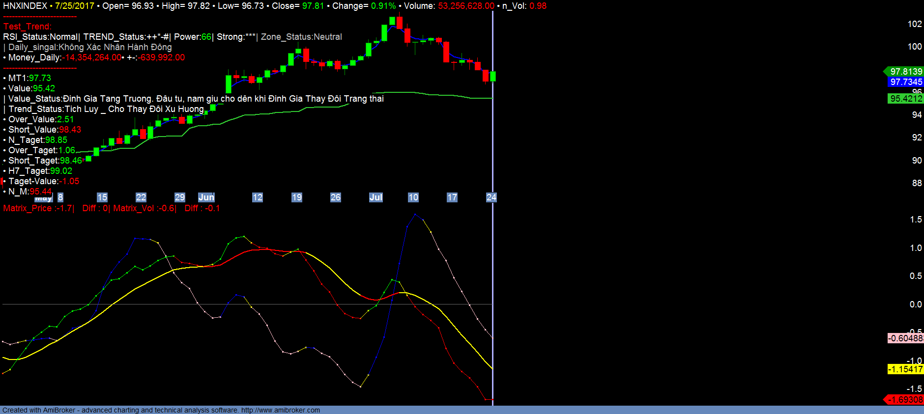 + Trend_up giảm, Money_in tăng. Tốc độ suy giảm Trend_up vẫn giảm, tuy nhiên dòng tiền Money_in bắt đầu tăng và chuẩn bị cho tín hiệu Lượng đi trước giá. Dự kiến khi Money_in lớn hơn Trend_up thì thị trường sẽ có 1 nhịp điều chỉnh tích lũy để kiểm tra lại tín hiệu đáy ngắn hạn, đồng thời kéo xu hướng giá tăng trưởng trở lại.