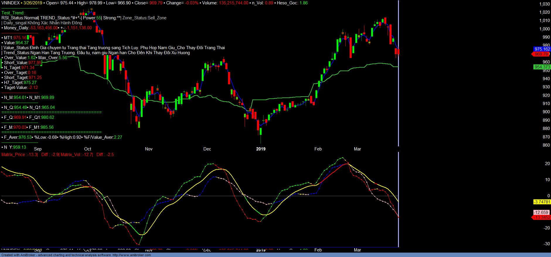 + VNINDEX tiếp tục điều chỉnh sau khi phục hồi 978-980 như dự kiến phiên trước, VNINDEX cũng suy yếu hơn do số mã trend_up suy giảm nhanh. VNINDEX hiên nay đã mất hỗ trợ giá trị Short_value. Dự kiến VNINDEX sẽ giao động trong biên độ hep 964-974 để chờ chốt NAV quí 4, trường hợp mất 964 (có thể xảy ra do VN30 như VIC test hỗ trợ đỉnh cũ tháng 04/2018 là 113 thất bại, và một số mã thuôc VN30 có thể bị sell_off ngắn ) thì VNINDEX sẽ về ngay hỗ trợ 950+- mới có thể thu hút dòng tiền gia tăng trở lại. Do Trend_up giảm, dòng tiền tiếp tục suy yếu nhanh. Vì vậy vẫn ưu tiên cơ cấu danh mục. Khá nhiều mã sau quá trình điều chỉnh mạnh đã về vùng hỗ trợ hấp dẫn, nhưng cần đánh giá triển vọng tăng trưởng kế tiếp. Các vị thế mở mua đầu tư mới, hoặc gia tăng tỉ trọng hiện vẫn không khuyến nghị cho đến khi có số liệu chốt NAV quí I/2019, xác nhận xu hướng định giá của VNINDEX, VN30 trong đầu quí II/2019, cũng như cho đến khi có tín hiệu Dòng tiền money_in tạo đáy, phục hồi trở lại. Danh mục đề xuất, khuyến nghị đầu tư tiếp tục cơ cấu và xem xét bổ sung khi có những cơ hội tăng trưởng tốt. Chi tiết tham khảo các Danh mục.