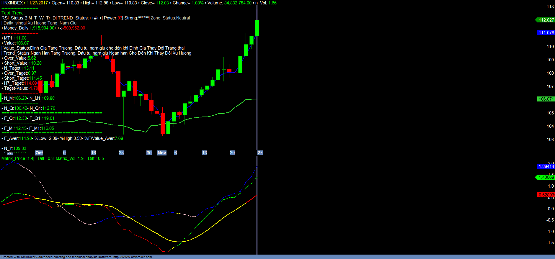 – VNINDEX vẫn tiếp tục tín hiệu tăng trưởng Strong_trend dưới ảnh hưởng của VN30. VN30 liên tục tăng mạnh, đi vào vùng Over mạnh. Dòng tiền ngắn hạn của VN30 vẫn chưa có dấu hiệu phục hồi tăng trở lại. Vì vậy nên hạn chế tham gia vào các mã trong VN30 đã tăng mạnh trong thời gian ngắn vừa qua. VN30 vẫn tiếp tục tăng trưởng mạnh trong dài hạn. Ngắn hạn do vượt quá cao giá trị định giá, VN30 cần điều chỉnh tích lũy để chờ định giá tăng trưởng cũng như xác nhận lại mức kỳ vọng tăng trưởng mới của thị trường. HNXINDEX đại diện chính cho nhóm mã midcap, penny, đầu cơ vẫn tiếp tục duy trì đà tăng và dòng tiền dịch chuyển tham gia trở lại tốt. HNXINDEX đã vượt đỉnh cũ 110.89 và vẫn đang xác nhận tăng trưởng dài hạn. Vì vậy nhà đầu tư vẫn có thể mở rộng vị thế mua ngắn hạn , đầu cơ đối với các mã đạt vùng mua, ưu tiên các mã tăng trưởng toàn diện và có tín hiệu Test_Trend thành công. Tuy nhiên do HNXINDEX đang đi vào vùng quá mua ngắn hạn. Vì vậy nhà đầu tư nên hạn chế mua đuổi giá cao. Vị thế mua sẽ được đóng lại khi tín hiệu thống kê cho thấy dòng tiền suy yếu. Chi tiết tham khảo Matrix_Fiter và các Danh mục.