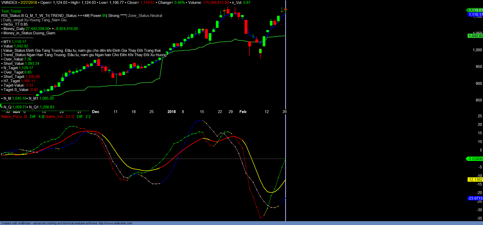 + Thị trường hiện nay khá tương đồng như thời điểm VNINDEX tích lũy để vượt vùng giá 660-680 tháng 8-12/2016. Dự kiến VNINDEX sẽ có thể vượt giá trị đỉnh cũ 1130 trong đầu tháng 03/2018, sau đó sẽ rung lắc điều chỉnh tích lũy trở lại. Quá trình rung lắc vượt, điều chỉnh kiểm tra lại đỉnh cũ sẽ kéo dài tính theo tuần. Vì vậy, giai đoạn này đòi hỏi nhà đầu tư thực sự kiên nhẫn. Các vị thế mua gom tích lũy cổ phiếu chỉ nên tiến hành khi thị trường rung lắc điều chỉnh về các vùng hỗ trợ tương ứng. Các mã tăng trưởng đạt vùng mua, nhà đầu tư vẫn có thể tiếp tục gia tăng tỉ trọng ngắn hạn, nhưng không mua đuổi giá cao khi VNINDEX vượt giá trị đỉnh cũ cũng như đi vào vùng Over mạnh. Dòng tiền mặc dù đã tăng, nhưng vẫn phân hóa và còn yếu. Vì vậy chỉ nên tập trung vào các mã tăng trưởng, đạt vùng mua cũng như vào trend tăng mới trong Danh mục Tăng Trưởng. Chi tiết tham khảo các Danh Mục.