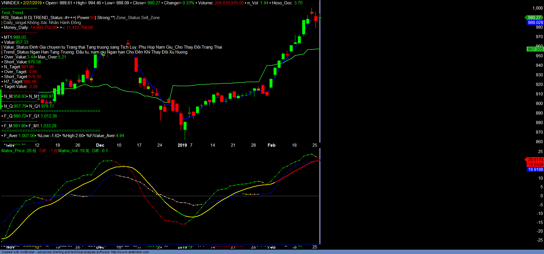 + VNINDEX như đã xác nhận tạo đỉnh ngắn hạn vùng 1000 với tín hiệu dòng tiền, trend_up suy giảm ở những phiên trước. Tuy nhiên diễn biến giảm mạnh khá mạnh, gây ảnh hưởng tâm lý tiêu cực dưới ảnh hưởng khá bất ngờ của hội nghị Mỹ_Triều. Mặc dù quá trình điều chỉnh khá sốc, nhưng chủ yếu do quá trình tăng mạnh và quá mua ngắn hạn của VNINDEX kéo dài trong nhiều phiên. Điểm tích cực là xu hướng ngắn hạn của VNINDEX sau thời gian dài đã có tín hiệu quay trở lại tăng trưởng. Quá trình điều chỉnh này có thể là cơ hội thu hút dòng tiền đầu tư tăng trưởng mới tham gia vào thị trường. Tuy nhiên cần tiếp tục chọn lọc, cơ cấu danh mục đầu tư cho những kết quả kinh doanh Quí I/2019 sẽ dự kiến trong tháng 03/2019.