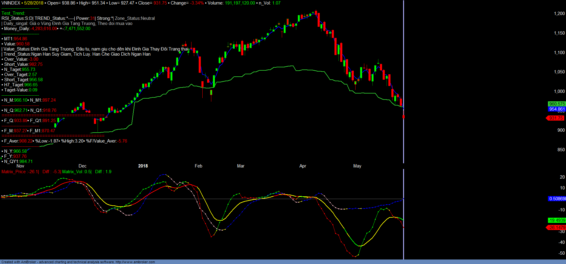+ Thị trường tiếp tục giảm mạnh , VN30 tiếp tục mất vùng hỗ trợ tăng trưởng dài hạn 910-920 và tạo áp lực bán mạnh với khối lượng gia tăng trên diện rộng của toàn thị trường. Áp lực giảm điểm mạnh và khối lượng gia tăng, những rủi ro trên thị trường hiện nay rất khó kiểm soát. Với đà rơi như hiện nay, dự kiến VN30 sẽ tiếp tục điều chỉnh về vùng giá 860-883 và sẽ có nhịp phục hồi ngắn hạn trong tháng 06/2018 để kiểm tra lại hỗ trợ dài hạn tăng trưởng dài hạn đã mất 920+-. VNINDEX điều chỉnh ít hơn VN30 với vùng hỗ trợ 900-925 tương ứng với vùng giá tháng 12/2017.